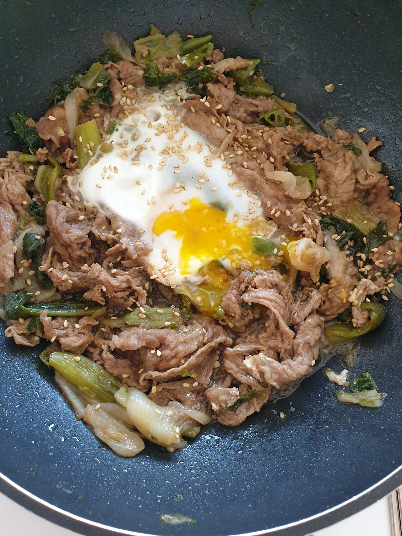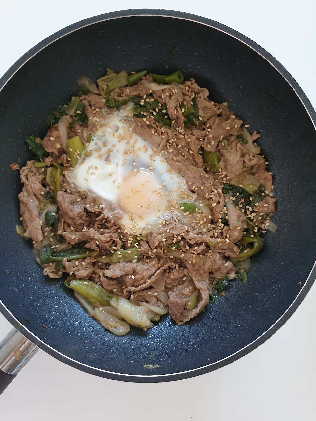 냉동실에 우거지도 있길래 같이 볶았다. 우거지는 의외로 소불고기와 잘 어우러졌다. 불 끄기 3분 전 청양고추 2개 썰어 넣고, 2분 전 참기름 두 스푼 둘러주고, 1분 전 달걀 하나 톡 깨서 흰자만 익을 수 있도록 팬 뚜껑을 닫아준다.