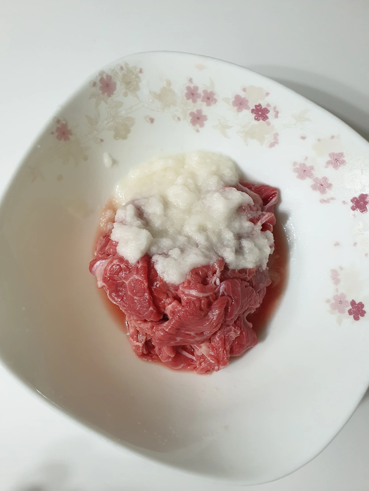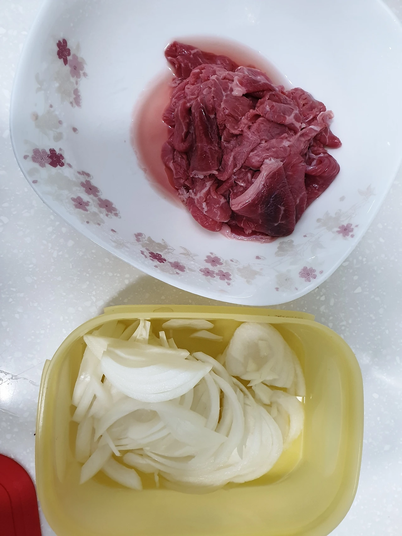 집에 돌아와서 쉬었다가 점심 준비를 하려고 냉장고를 열었더니 엄마가 두고 간 소고기가 눈에 들어온다. 많이도 사셨네. 따뜻한 쌀밥 짓고 불고기 만들어 점심이라도 대접하고 보내 드릴걸. 후회하며 혼자 먹을 불고기를 만들어 본다.