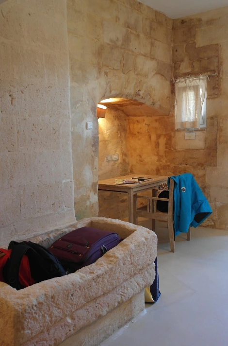 마테라의 구시가지에는 당시의 동굴 주거지 형태를 개조하여 만든 동굴 호텔이 여러 곳이다. 우리가 오늘 머물 숙소도 동굴 호텔이다. 널찍한 더블침대가 놓인 객실은 동굴 분위기를 풍기고 있었다. 깔끔하게 마감되어 흙가루가 날리지만 않을 뿐, 객실 안은 은은한 황톳빛이다. 아치형으로 흙을 파낸 자리에 딱 들어맞는 책상, 깊고 길쭉한 구유 모양의 흙 대야가 입구에 자리 잡고 있다. 흙 대야에는 캐리어 두 개가 들어가고도 공간이 넉넉하다. 세면대도 황톳빛, 욕실도 온통 흙빛이다. 객실 한쪽 구석은 불투명한 유리가 바닥을 덮고 있는데 유리 아래는 ‘진짜’ 동굴이다. 실내 장식을 따로 할 것도 없이, 동굴이라는 공간을 한껏 활용했다.