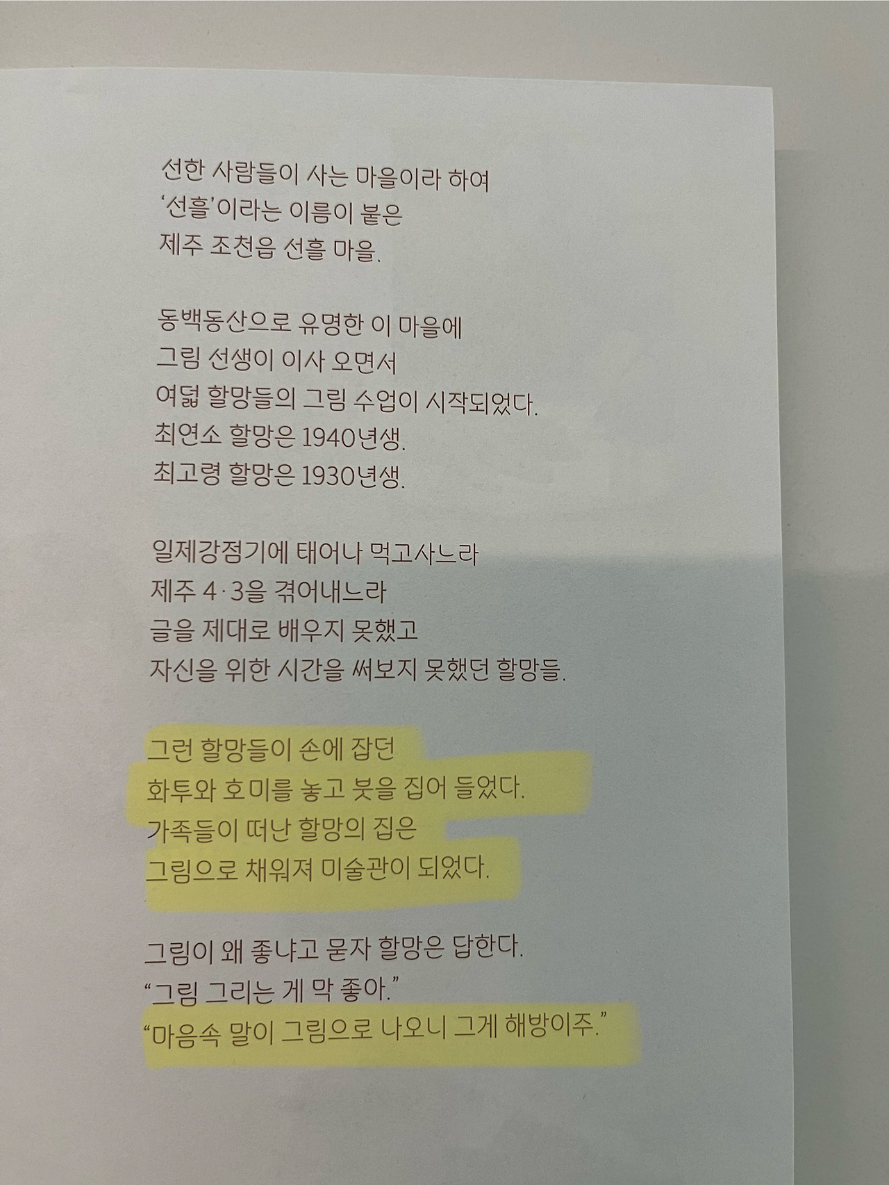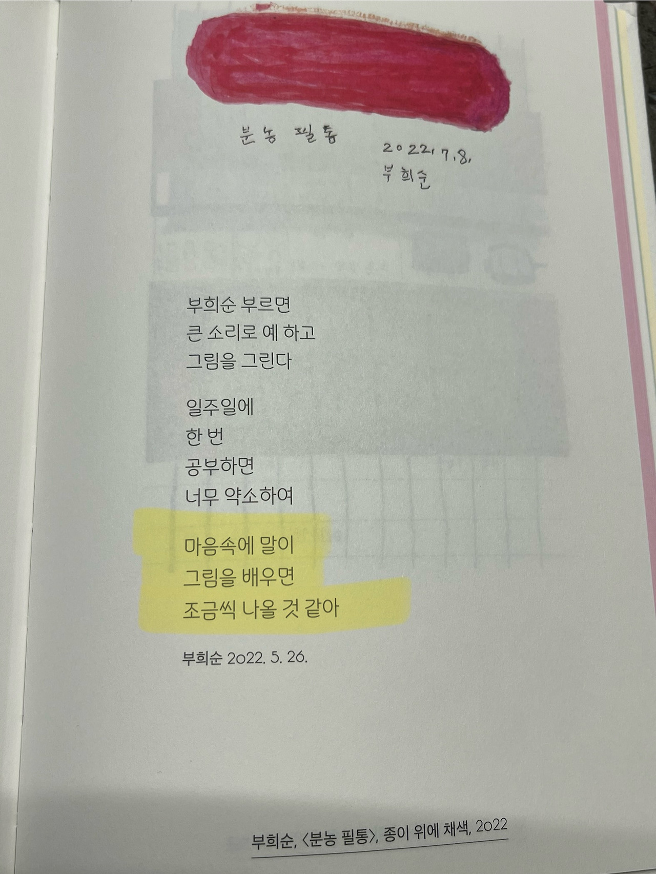 부희순 할망은 ‘마음속에 말이 그림을 배우면 조금씩 나올 것 같아.’라고 <부농 필통>을 그리며 글을 적었다. 할머니들의 그림 속에 할머니들의 말과 마음이 담겨있다. 그래서 더욱 귀하게 읽었다.