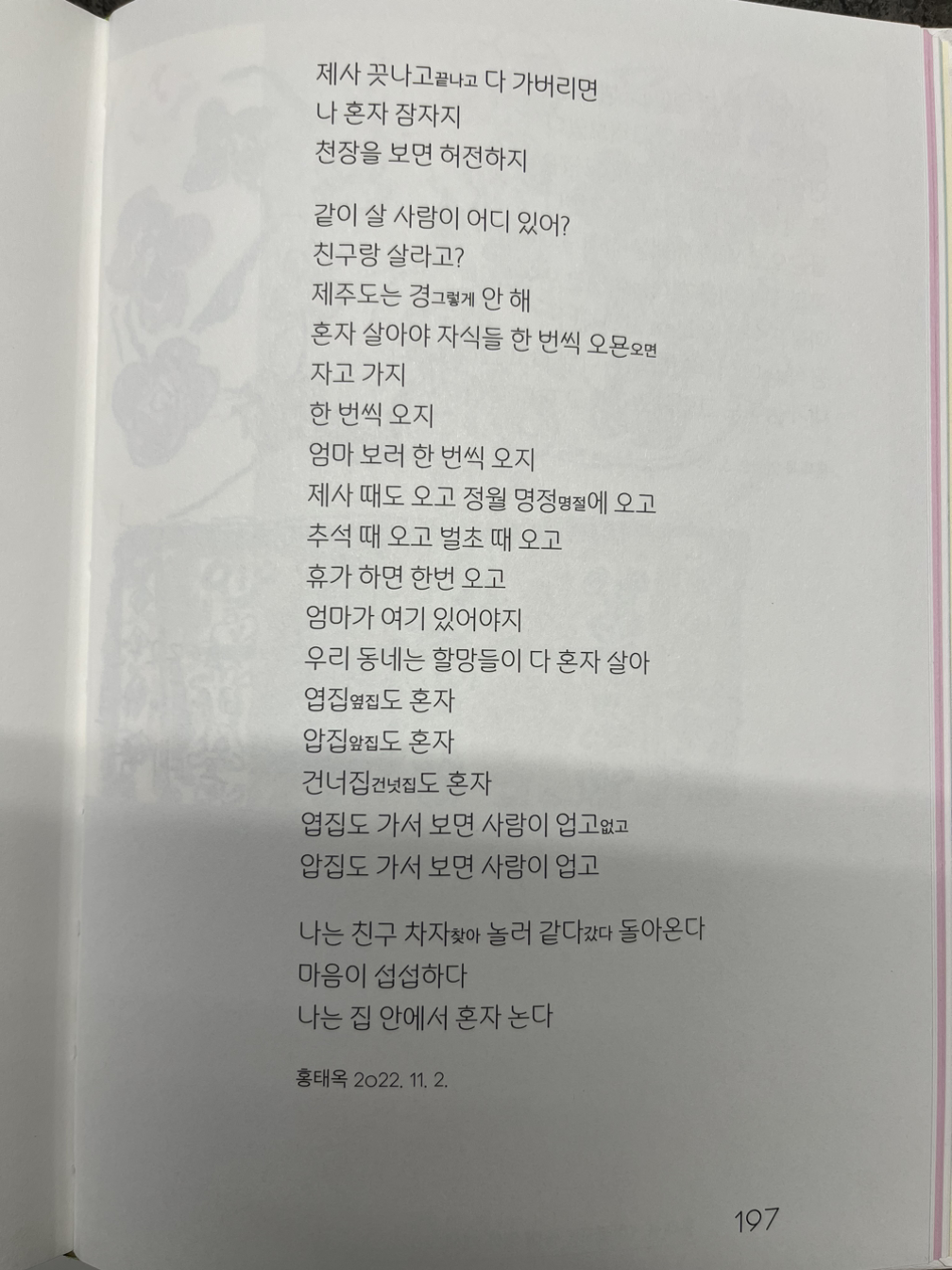 아가의 동근 어깨는 귀여운 쌀 한 톨처럼 보이고, 할머니의 동근 어깨는 식구들 밥 해 먹이느라 왠지 더 가냘퍼져서 두툼한 스웨터를 걸쳐주고 싶은 마음이 들게 한다. 그 작은 어깨로 둥근 밥상에 앉아 홀로, 긴 밤 지새우고 새벽녘까지 그림을 그렸을 할머니를 떠올린다. 그림이랑 벗 되었을까, 그림이랑 이야기 나누었을까, 그림과 함께 저문 하루를 보내고, 새 하루를 맞이했을까. 할미는 “내 나이가 여든여덟 개인데 내년이 어떻게 있냐(윤춘자 할망)“고 대수롭지 않게 말한다.