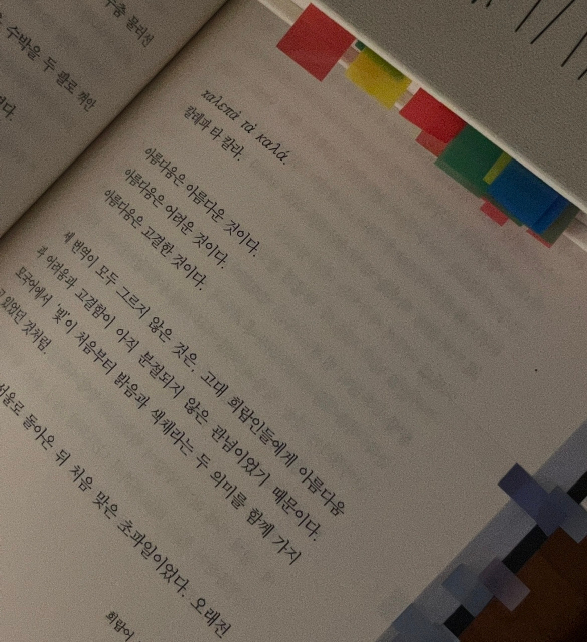 『희랍어 시간』은 큰 사건 없이 흘러가는 소설이지만, 읽는 동안 서서히 마음에 미세한 균열을 내기 시작한다. 마치 너무 오래 꽁꽁 언 강이 아주 미세하게 균열을 내는 시간들처럼.