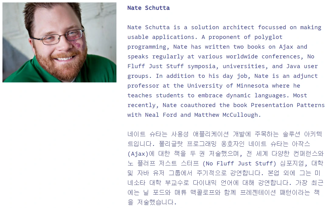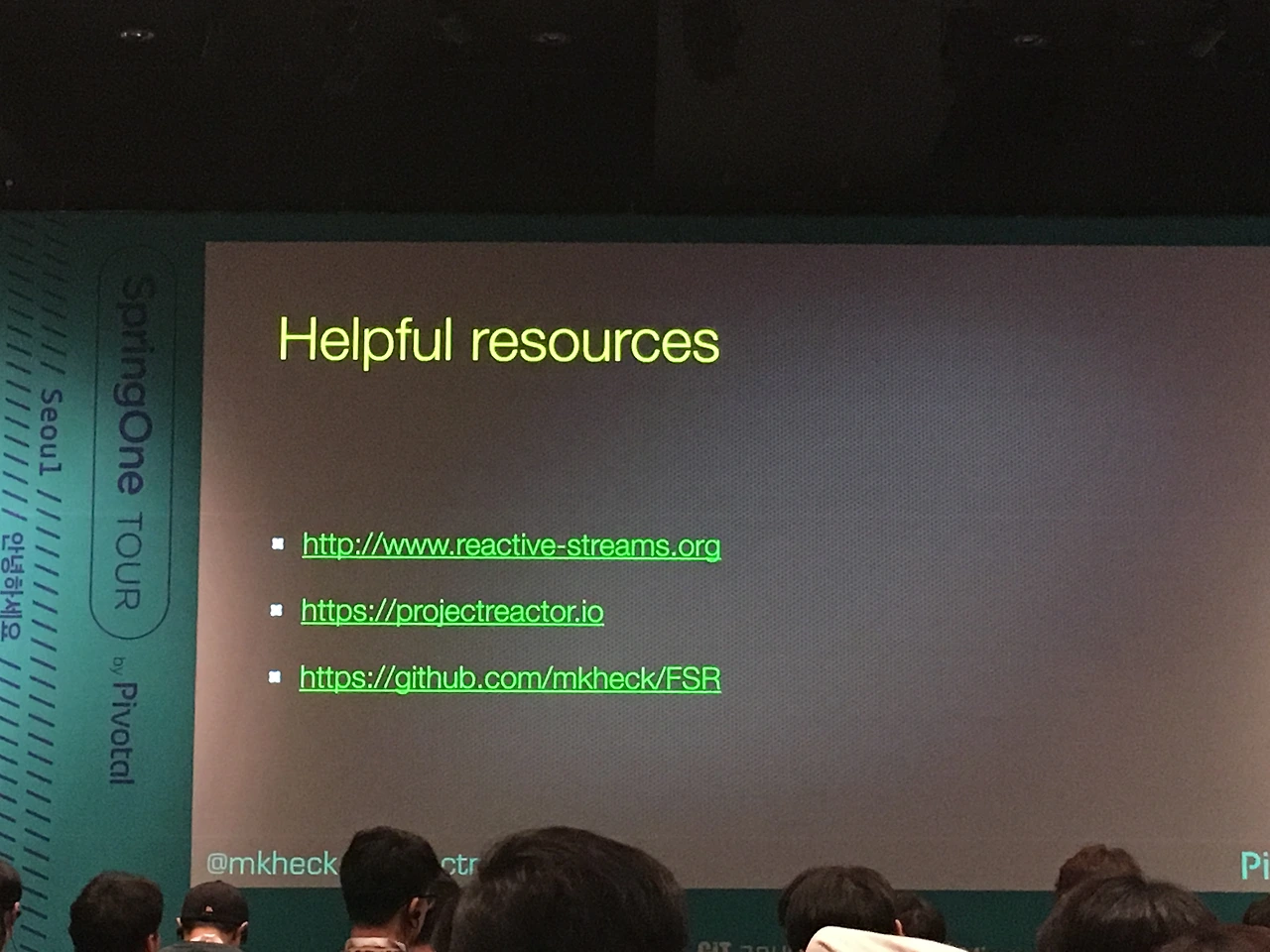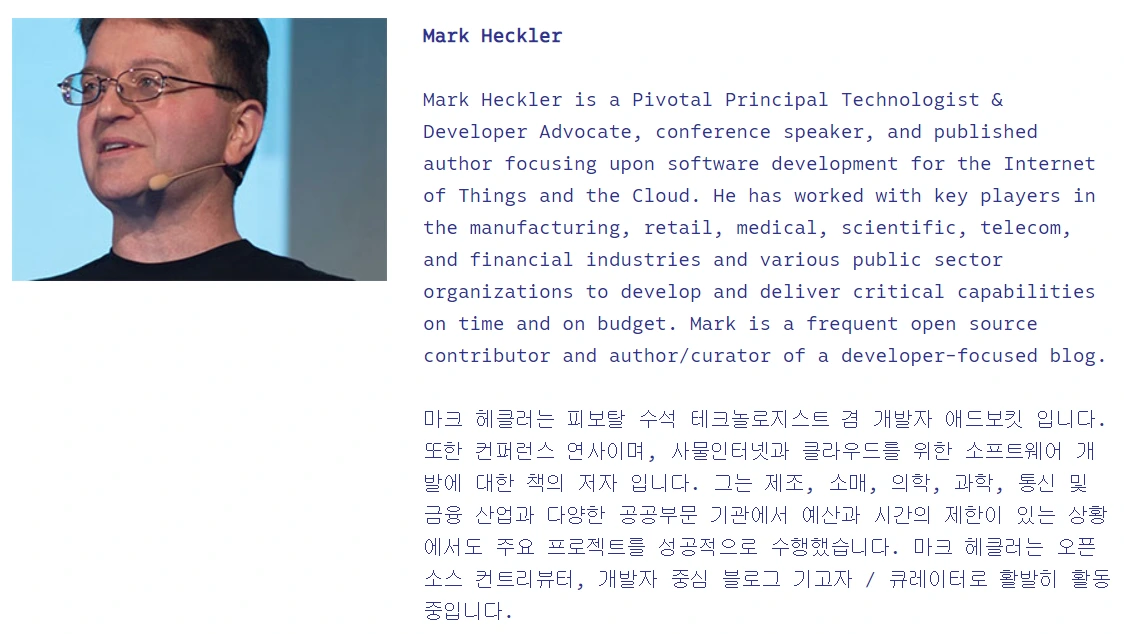 발표자는 Mark Heckler 라는 Pivotal 개발자인데 자바 챔피언 출신이다. 트위터를 사랑한다는데, 궁금한 점이 있다면 트위터로 물어보면 바로 답변해줄 것 같다.