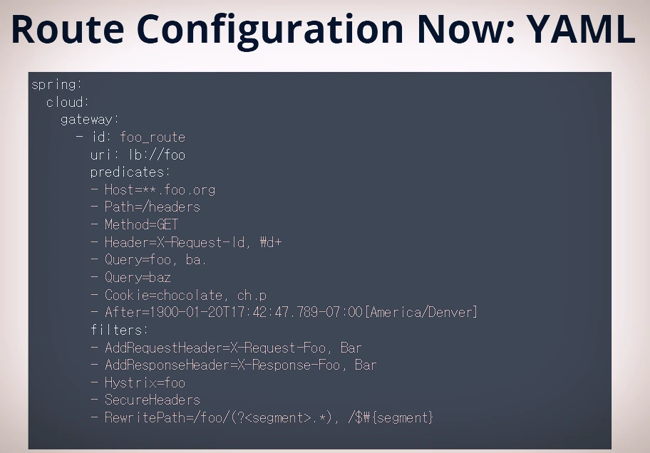 기존에 Zuul 에서의 Yaml 컨피그레이션 복잡함을 개선하기 위해서 Spring Cloud Gateway에서 새로운 방식을 도입하였다. 기존 방식도 사용이 가능하다.