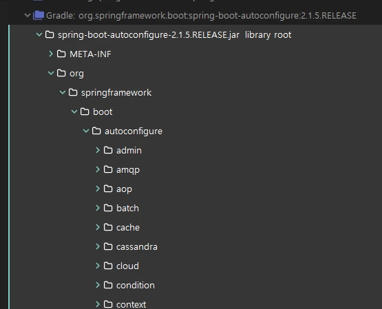 참고로, 나머지 코드는 샘플(1)과 같다. AutoConfiguration 코드를 필자가 직접 구현하였는데, 만약 Pivotal(스프링 개발회사)에서 네이버 Open API 연동에 대한 AutoConfiguration 을 제공해준다면 어떻게 될까? 우리는 BlogAutoConfiguration 를 직접 구현할 필요가 없다. 왜냐면, 스프링부트에 이미 작성이 되어있을 것이다. 우리가 해야하는 일은 무엇일까? 스프링부트 프로젝트에서는 기본적으로 org.springframework.boot.autoconfigure 디펜던시가 추가 되는데, 아래와 같이 수많은 기능이 작성이 되어있다. 스프링부트에서 이미 제공을 해준다면 아마도 해당 패키지에 AutoConfiguration 클래스가 정의가 되어있을 것이다.
