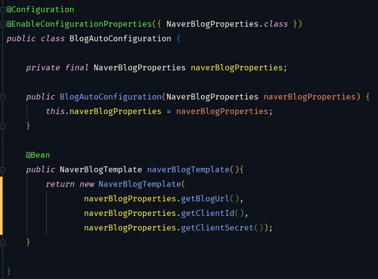 그리고, 이제 가장 중요한 AutoConfiguration 클래스를 작성하겠다. @EnableConfigurationProperties 를 선언해주고, 위에서 작성한 NaverBlogProperties.class 를 셋팅해준다. 이렇게 정의하면, application.properties 에 선언한 속성 값들... 즉, naver.openapi 프리픽스로 설정한 속성값을 모두 사용할 수 있다.