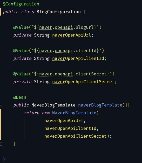 그리고, @Bean 어노테이션을 사용해서 naverBlogTemplate 이라는 빈을 생성해주자.