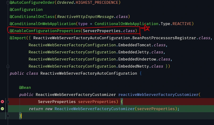 org.springframework.boot.autoconfigure.web.reactive 패키지에 있는 클래스인데, 아래와 같이 @EnableConfigurationProperties 어노테이션과 함께 ServerProperties.class 를 정의해주는 것을 확인할 수 있다.