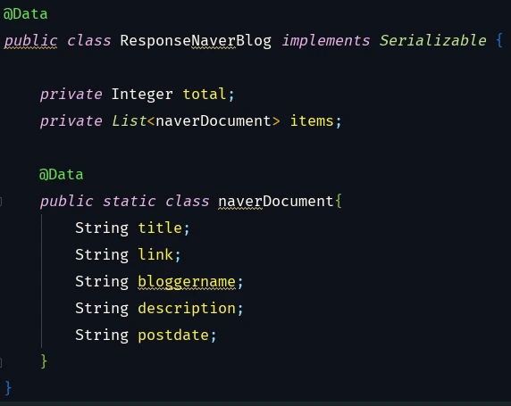 리턴 타입 ResponseNaverBlog 클래스는 아래와 같다.