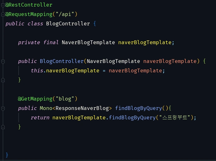 아주 간단한 Controller 을 만들어서 데이터를 호출해보자. 위에서 정의한 naverBlogTemplate 빈을 주입해서 사용할 것이다.