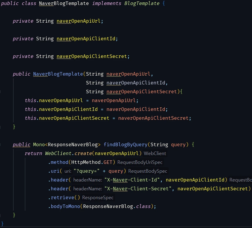 샘플 코드는 블로그 데이터를 조회하는 메서드를 구현하였다. WebFlux 의 WebClient 를 사용하였고, 리턴 타입은 Mono<ResponseNaverBlog> 로 하였다.