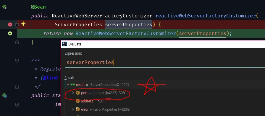디버깅을 해보자. server.port 값에 필자가 정의한 8081 포트가 설정되어있는 것을 확인할 수 있다.