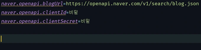 오픈API 호출하는 코드를 Template 패턴으로 작성하였다. NaverBlogTemplate 라는 클래스를 생성하였고, 생성자에서는 OpenAPI 호출을 위한 기본 정보를 주입한다. NaverOpenAPI 를 위해 필요한 필수 정보는 아래오 같다.