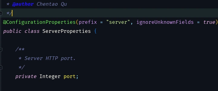 스프링부트 애플리케이션을 구축하면서 복잡한 설정을 추가하지 않아도 된다. 심플하게 프로퍼티를 정의해주면 된다. 만약 프로퍼티에 정의를 해주지 않는다면, 기본으로 설정된 값이 셋팅 될 것이다. 참고로 현재 스프링부트 2.1.5.RELEASE 에서의 server.port 기본은 8080포트이다. 스프링부트 autoconfigure 패키지에서 해당 값을 셋팅해주는 곳을 찾아보자. org.springframework.boot.autoconfigure.web 패키지에서 ServerProperties 클래스를 보면, 필자의 샘플코드와 유사하게 @ConfigurationProperties 어노테이션을 사용해서 속성값을 매핑하는 클래스가 정의가 되어있다.