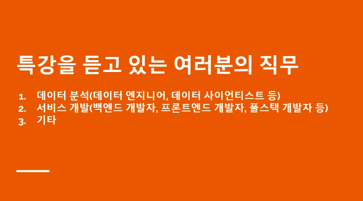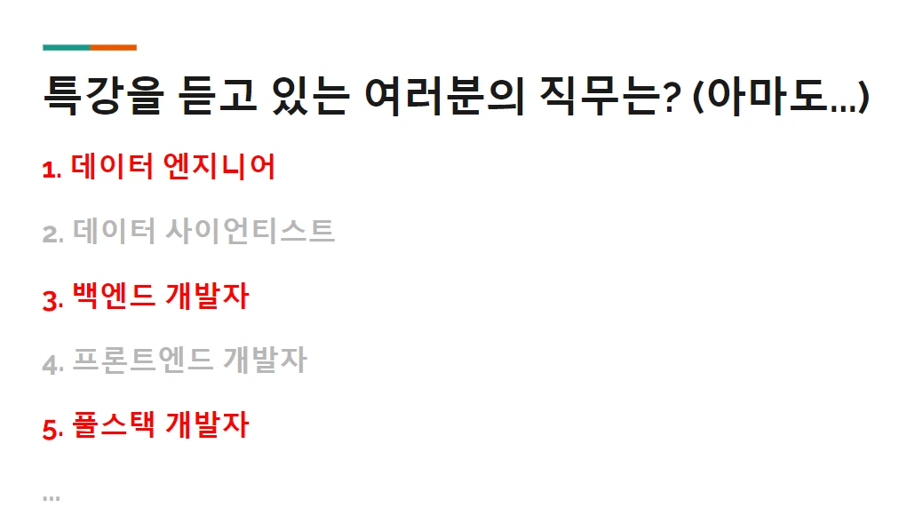 학생들의 진로가 아직은 명확하지 않기 때문에, 개발자가 되었을 때 어떤 업무를 하는지에 대해서 설명하였다. 데이터분석과 라서 데이터 엔지니어를 희망하는 학생들이 많을 줄 알았는데, 생각보다 웹서비스 개발에 관심 있는 학생들이 꽤 많았다. 사실, 필자는 데이터 엔지니어가 아니라서 학생들이 재미없어하고 강의 중 꾸벅꾸벅 졸면서 재미없어할 줄 알았는데, 의외로 강의 중 잠들어버리는 학생들이 거의 없어서 다행이었다. (한두 명 있기는 했지만...)