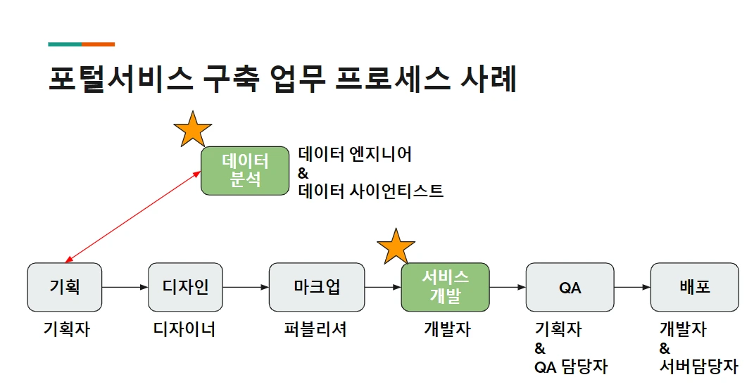 웹서비스 개발 방법론에서는, 먼저 웹서비스에 대한 간략한 소개와 데이터 분석 및 개발자 직무에 대한 내용을 주로 하였다. 데이터분석과 학생들이라서, 웹서비스에서 데이터분석 영역이 어떻게 활용되는지에 대해서 간략하게 소개하였다. 회사 중요 정보는 공유할 수 없어서 추상적인 내용으로만 전달하였지만, 그럼에도 불구하고 학생들이 관심을 갖고 들어주었다.
