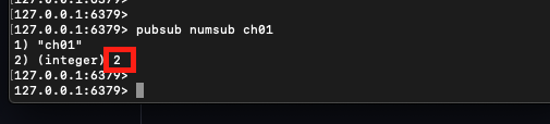 "pubsub numsub channel" : pubsub 명령어를 사용하면 해당 채널에 커넥션을 연동 중인 수신자의 개수를 확인할 수 있다.