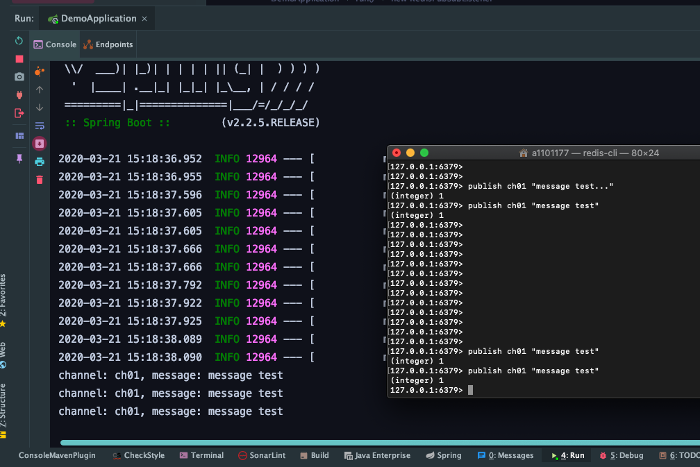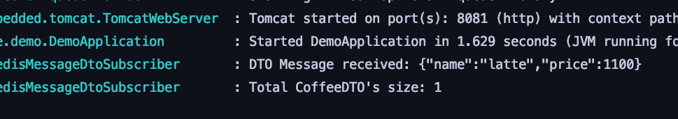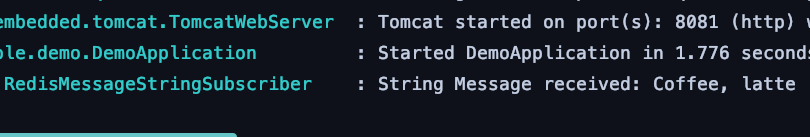 RedisPubSubListener 를 익명클래스로 작성하였는데, 별도의 클래스로 분리하는게 깔끔하다. pub 메시지 발행은 redis-cli 에서 실행하였다. 아래와 같이 메시지를 잘 구독하는 것을 확인할 수 있다.