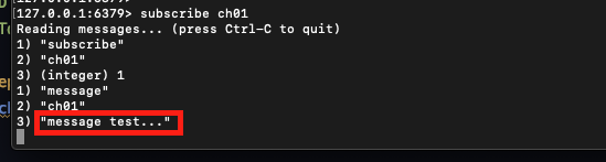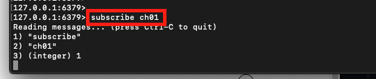 "subscribe channel" : "ch01" 이라는 이름의 채널에 메시지를 수신해보겠다.