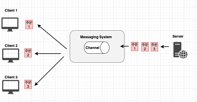 순차적으로 메시지를 소비할 때, 처리 시간이 너무 느려서 메시지들이 채널에 쌓이게 되는 경우가 발생하는 경우가 발생한다면, 심각한 병목현상이 발생할 수 있다. 해결하기 위해서, 소비할 수 있는 클라이언트를 늘려주면, 동시에 여러 메시지를 처리할 수 있게 구축할 수 있다. 아래 그림은, 주문 3건을 3개의 클라이언트가 각 한 개씩 처리하는 그림이다.