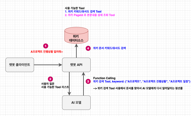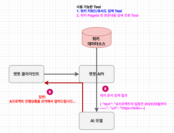 - "위키 검색" Tool 호출 요청 (키워드: "A 프로젝트", "진행 상황")