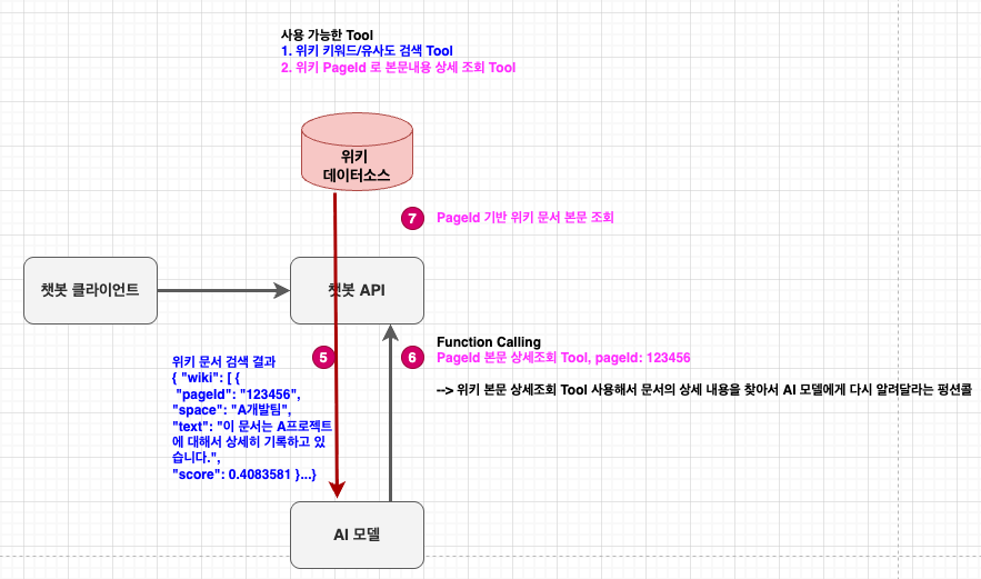 - AI 모델이 Function Calling 으로 키워드 검색 문서를 요청하면, 스코어가 높은 상위 문서들을 AI모델에 알려주는 방식