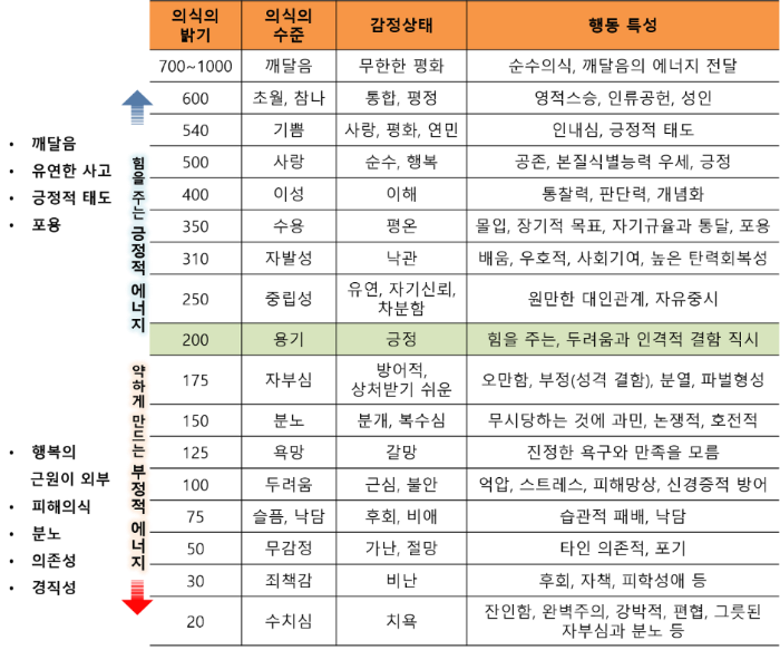 데이비드 호킨스 박사가 제시한 의식 수준 연구 결과에 의하면, 인류의 85%가 200(용기) 이하로 측정되며, 의식의 전체 평균 수준은 대략 207이라고 한다. 그는 상급 레벨에 있는 극소수 집단((500(사랑) 이상은 세계 인구의 4%)이 하급 레벨에 있는 거대집단의 약함을 상쇄하여 평균을 달성한다고 하였다.