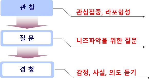 상담을 잘하는 사람들은 질문도 그렇지만, 경청도 매우 잘합니다. 대부분의 영업사원은 내가 더 많이 알고 있다는 생각에 자꾸 혼자 이야기하는데 니즈 파악 단계에서는 잘 듣기만 해도 많은 것을 얻게 됩니다. '경청'이 습관이 되어야 하고, 들으면서 상대방 관심사가 무엇인지를 알아야 하는 것이죠.