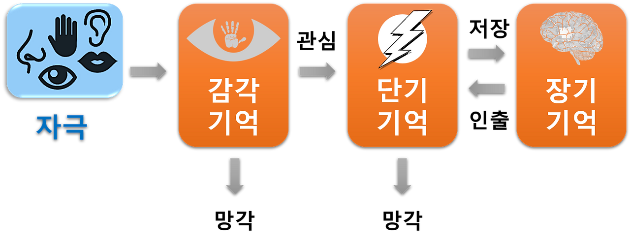 위의 이미지처럼 시각‧청각‧촉각‧후각 등을 통해 입력된 정보는 1~4초 정도 매우 짧은 시간 동안 기억(감각 기억)하게 되고, 이 중 일부가 선택적으로 단기 기억으로 이동합니다. 또 그중 일부만 장기기억으로 이동하게 되고 오래 기억에 남습니다.