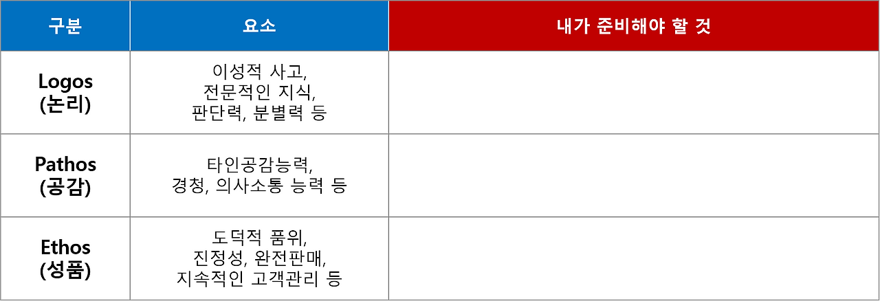 아래에 정리된 표를 참고하셔서 앞으로 설득력을 높이기 위해 내가 보완해야 할 것은 무엇인지 상세하게 적어보세요. 생각정리에 도움 되셨으면 좋겠습니다.
