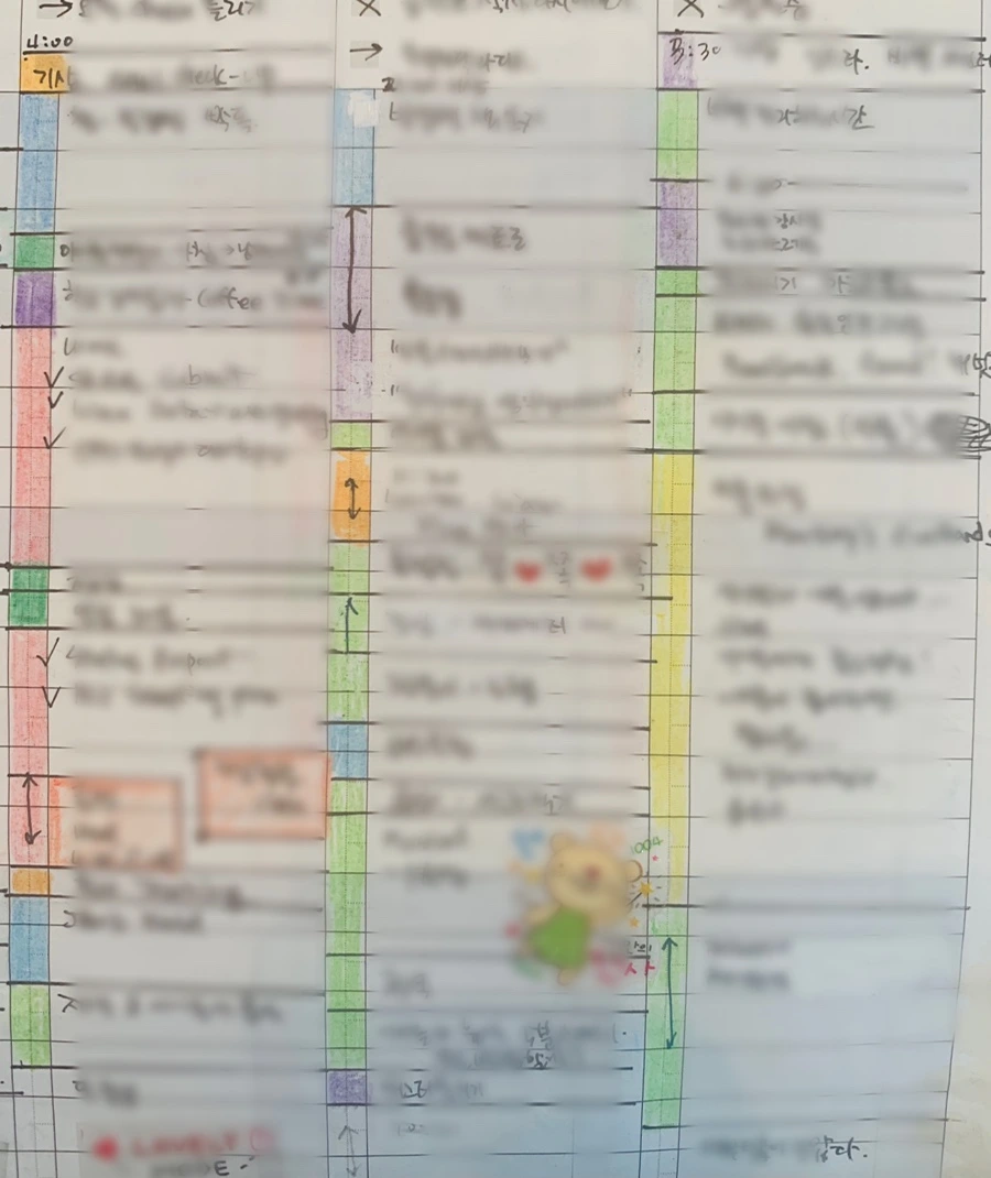 일을 한 날에는 당연히 핑크색이 많이 보이지만, 대신 주말이나 쉬는 날에는 옐로, 그린, 블루, 퍼플 등이 많이 보이지? 충분한 휴식, 취미, 자기계발, 그리고 아이들과의 시간에 많이 할애하려고 했어. 또한 매일의 하루 중에서도 잠시라도 각 카테고리들의 시간들을 조금씩 다 가지려고 노력했단다.