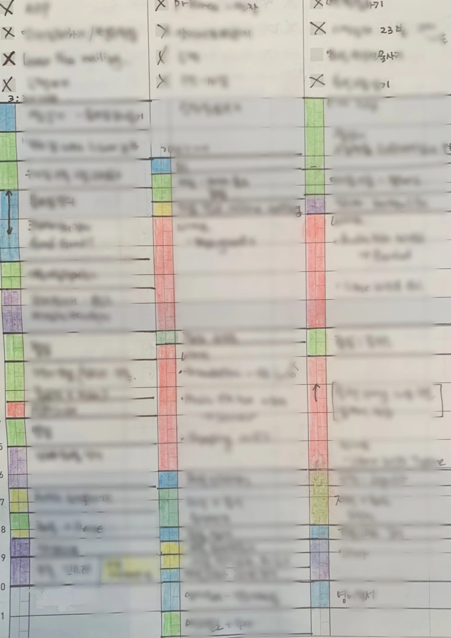 이제부터라도 지금 내가 쓰고 있는 이 시간이 어떤 성격인지 그 목적을 인지해보면 돼. 그리고 지금 나에게 없는 색의 시간. 보통은 그린, 블루 등이 많이 없겠지? 그 색을 내 일상에 조금 더 많이 넣어보기!