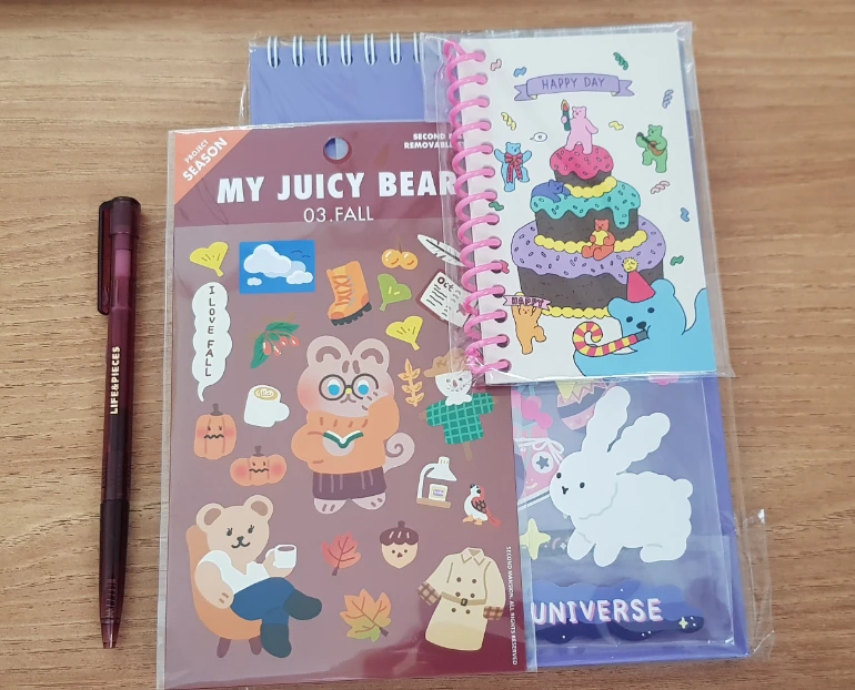 책을 사면서 노트랑 수첩이랑 스티커랑 펜도 샀다. 저 펜 색깔도 이쁘고 (라벤더색) 필기감도 부드럽다. 해피데이 수첩은 아침에 감사 목록 적을 때 딱일 것 같다. 곰돌이들이 넘 귀엽다. MY JUICY BEAR는 곰 시리즈지만 가운데 있는 안경 쓴 애는 다람쥐 같다. 저 애를 보자마자 '이건 사야 돼!'하며 집어들었다. 토끼가 없으면 불안하기 때문에 토끼 스티커도 샀다. 원하는 것을 잔뜩 살 수 있는 풍요로움에 감사하다.