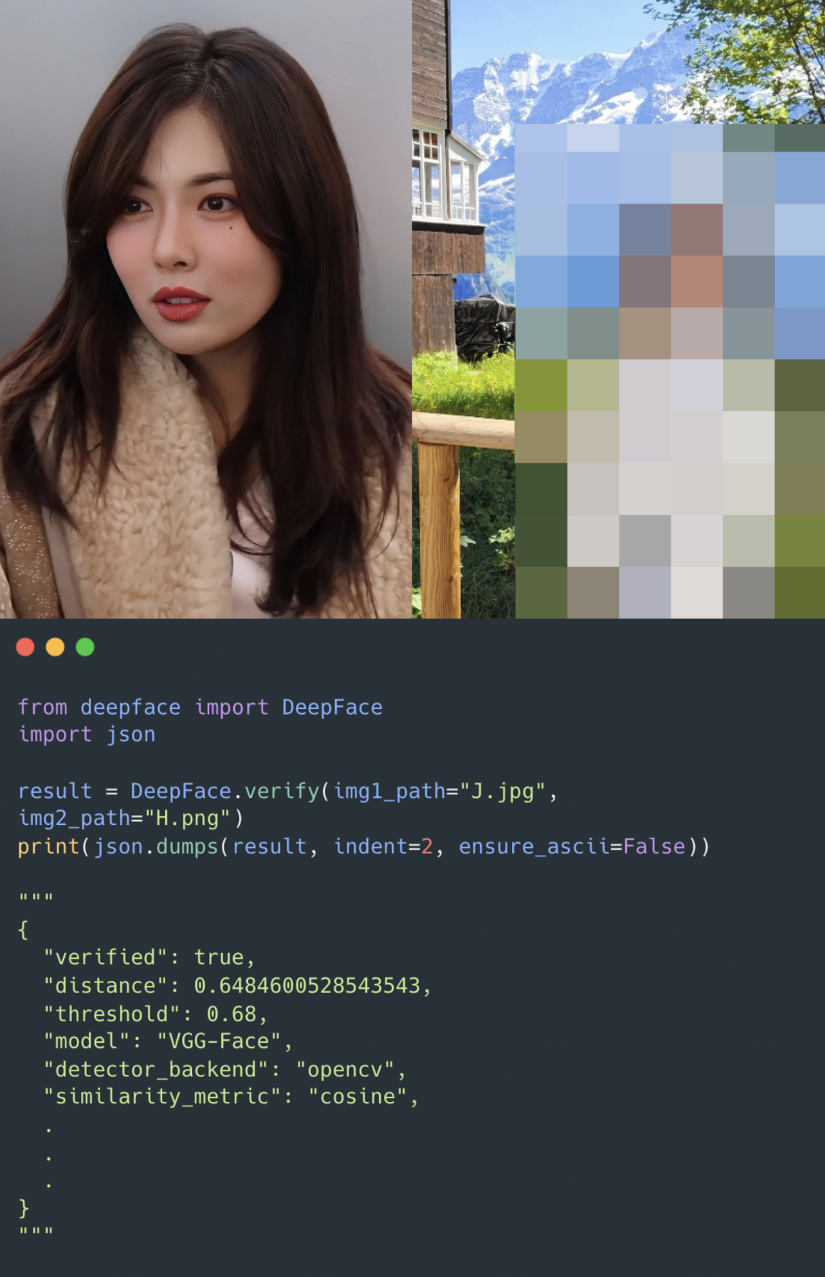 J를 볼 수 없어 아쉬운 독자보다 더 아쉬운 마음으로 글을 쓰고 있으나 J는 평생 볼 수 없을 듯하다. 그래서 가끔 나는 J에게 이쁜 얼굴 두고 뭐 하냐는 식의 이야기를 하곤 한다. 글을 쓰는 필자가 제일 아쉬우나 왼쪽의 결과가 보여준다. 현아 얼굴과 일치하는지 DeepFace에서 verified가 true로 동일 인물로 판단한다. 필자도 이게 될지 몰랐으나 AI도 동일 인물로 판단하니 신뢰를 가지고 현아랑 매우 닮았다고 생각해도 전혀 이상하지 않다. 나 또한 J가 현아와 얼굴인증을 통과할 줄은 몰랐다. 내 눈이 틀리지 않았음을 처음 확인하는 순간이었다.