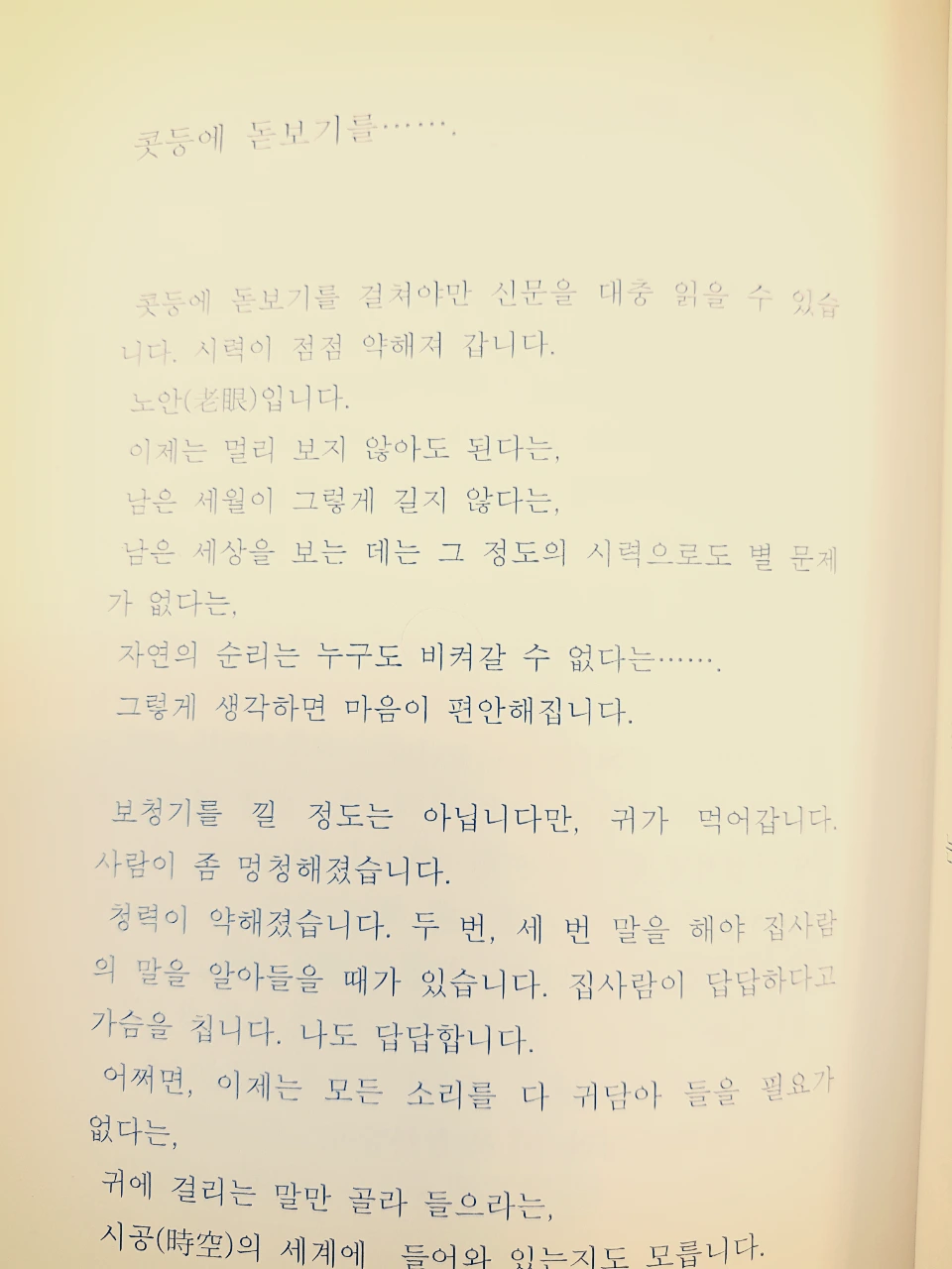 아버지는 자신의 글에 ‘귀가 먹어간다’라고 기록하셨다. 그러나 정말로 귀가 멀어가는 것이 아닐지도 모른다. 살아온 시간이 많아 여기저기 다른 것들에 눈을 돌리고 귀를 돌리며 사는 일이 고단하셨을 수도 있다. 내 아버지, 좋은 것은 듣고 나쁜 것에는 귀를 잠시 닫아 둔다. 아니, 나쁜 것이 와도 그저 무심히 노안의 눈으로 그것이 지나가기를 기다리신다.