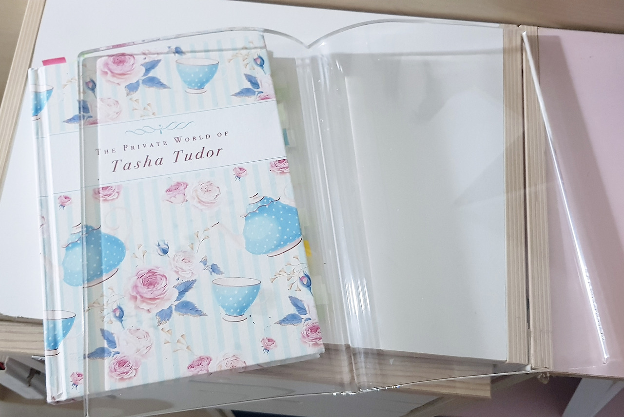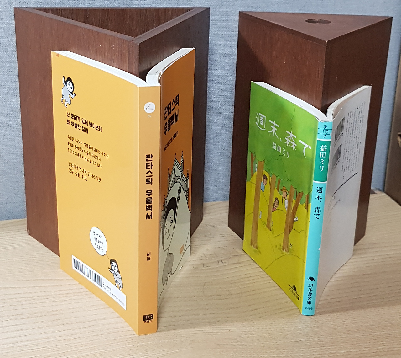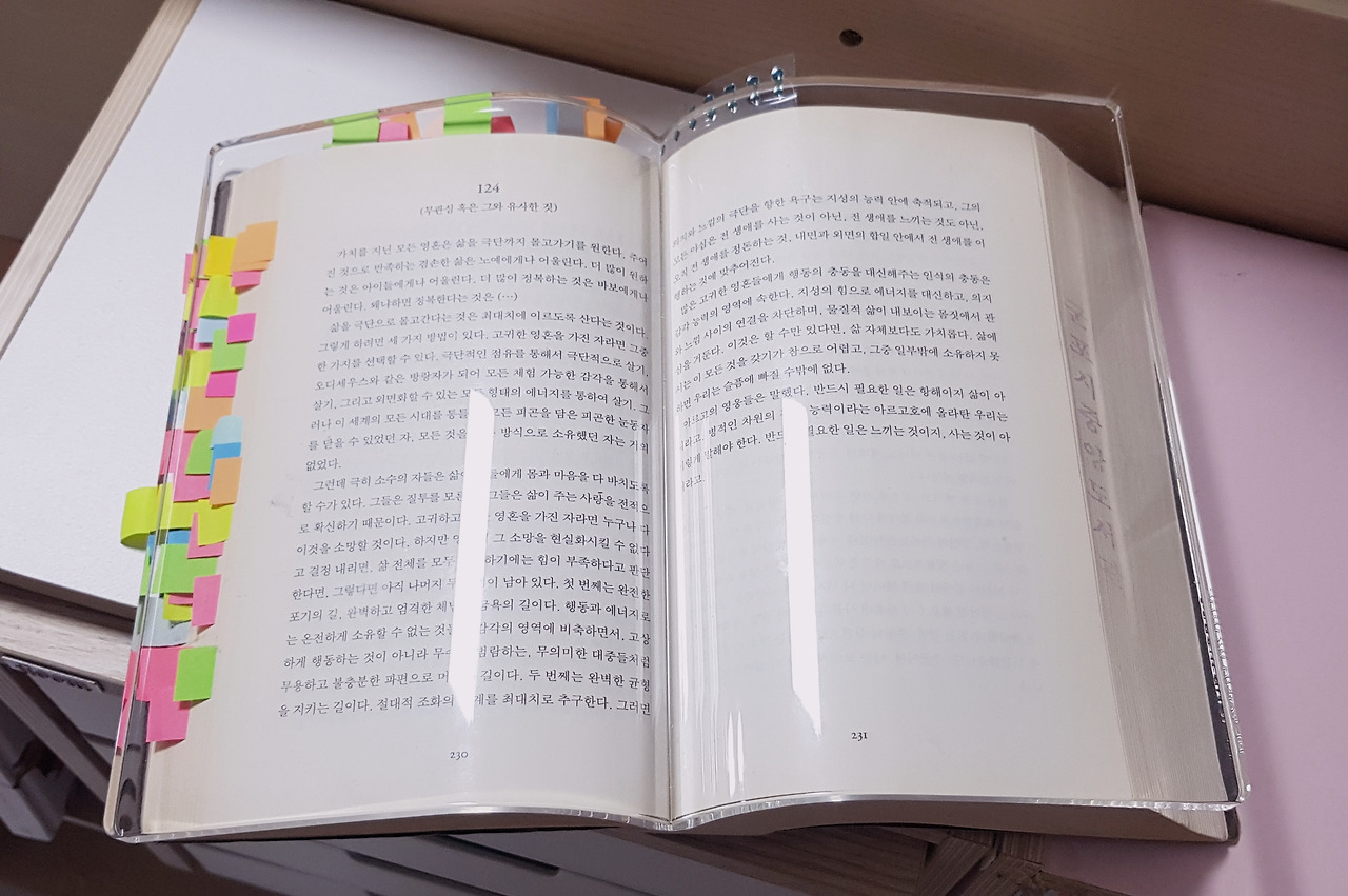 필사를 할 때는 정말 유용하다. 이쪽으로도 저쪽으로도 넘어지지 않고 책장의 균형을 맞추어 준다. (펼쳐 놓은 책등 안쪽 부분의 글자들이 조금 볼록해 보인다는 것은 약간의 단점.)