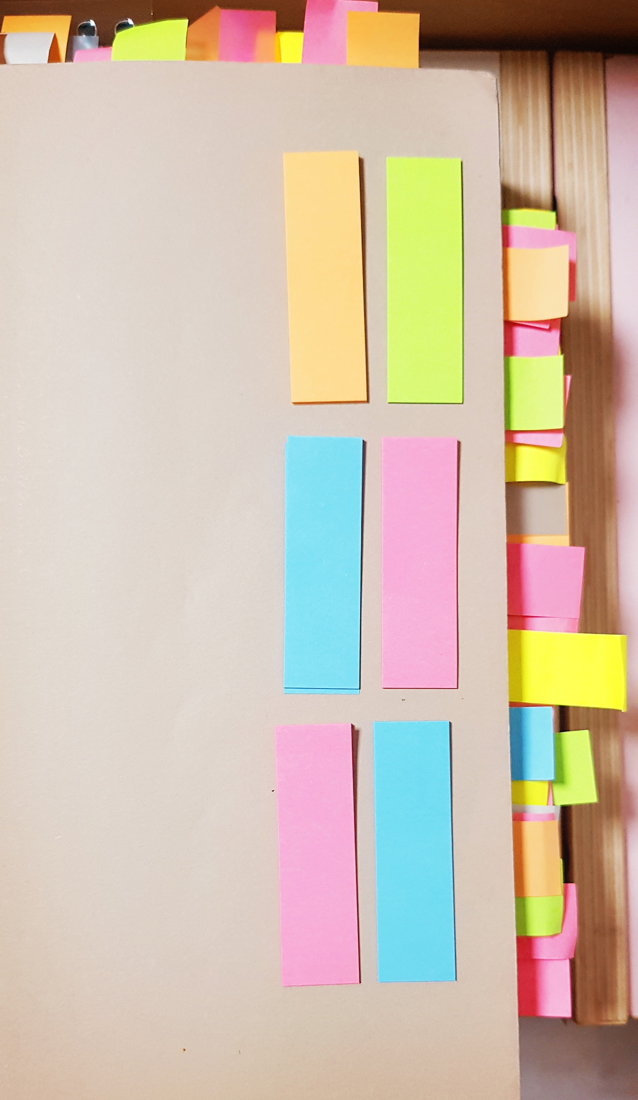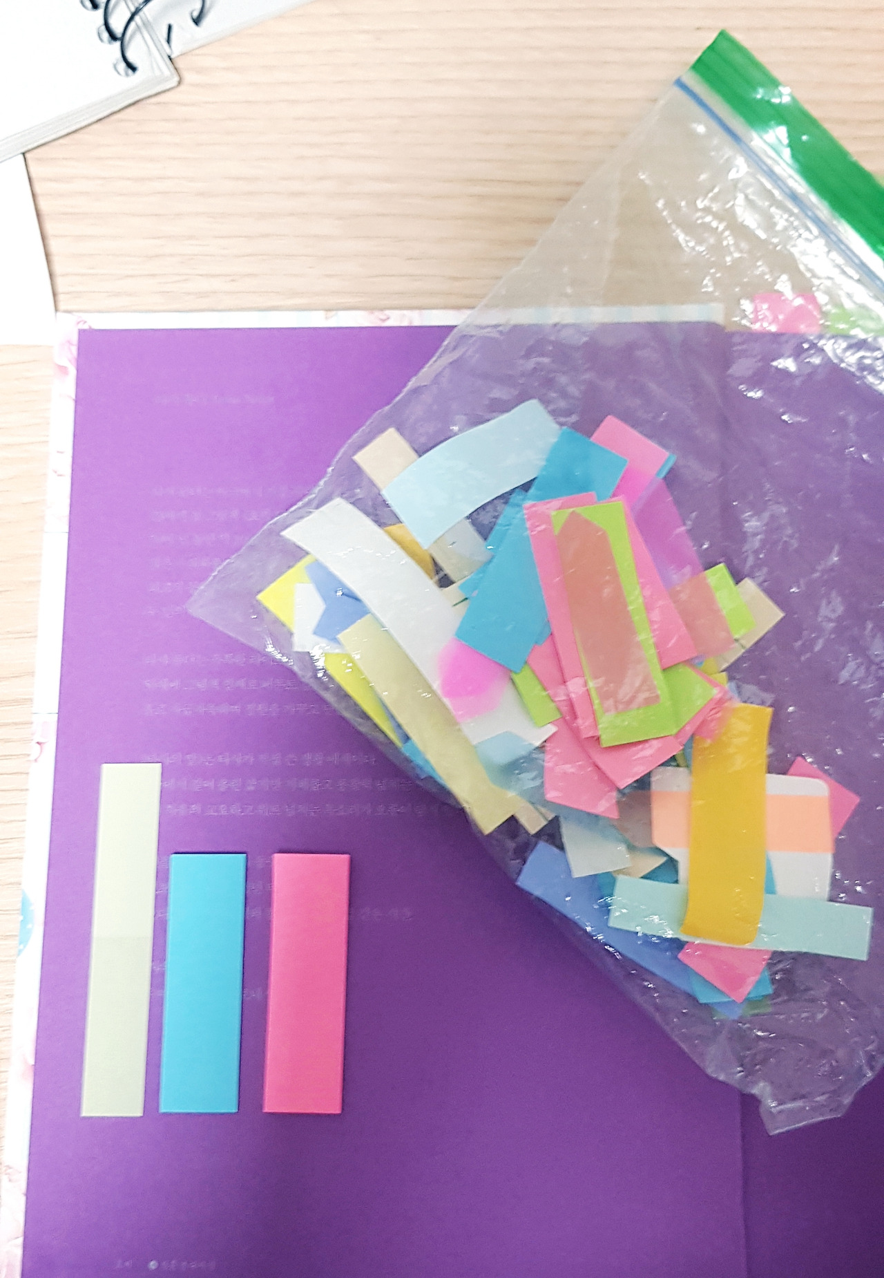 이와 더불어 집이 아닌 곳에서 '외부 독서' 혹은 '서서 독서'를 해야 할 때도 '붙임쪽지'는 유용한 내 친구가 되어 준다. 속표지에 붙임쪽지들을 잔뜩 붙여 두면 '소중한 문장'을 만날 때마다 이를 놓치지 않고 붙잡아 둘 수있다. (붙임쪽지 구입이나 재활용은 나의 오랜 취미이기도 하다.)