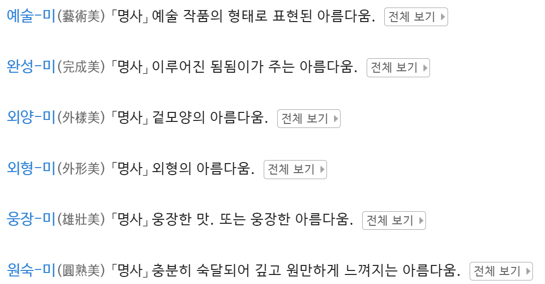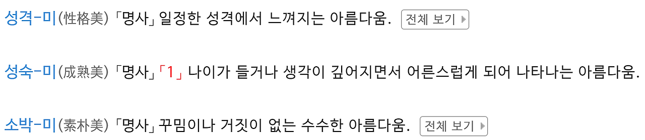 표준국어대사전(출처: 국립국어원 누리집)에다가 '아름다움'을 뜻풀이로 해서 찾아달라고 하면(또, 거기에 더해 음절 수는 3음절로 제한해 달라고 하면) 대략 68개의 단어를 찾아 준다. 이중 내게 있는 '미'는 무엇일까? 흠.. 눈을 씻고 손을 씻고 발을 씻고 찾아봐도 내 안에서 '아직' (혹은 남은 생애 전부를 다 합쳐도) '미'를 찾아내기란 참 힘들 듯하다.