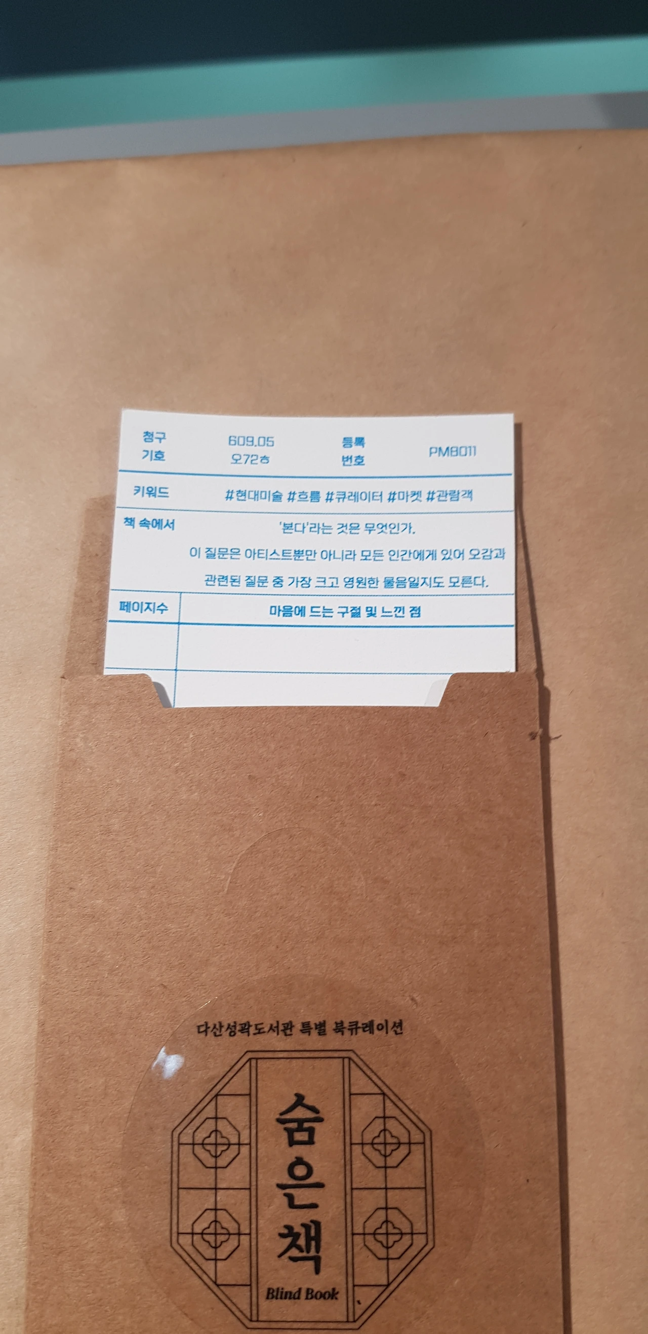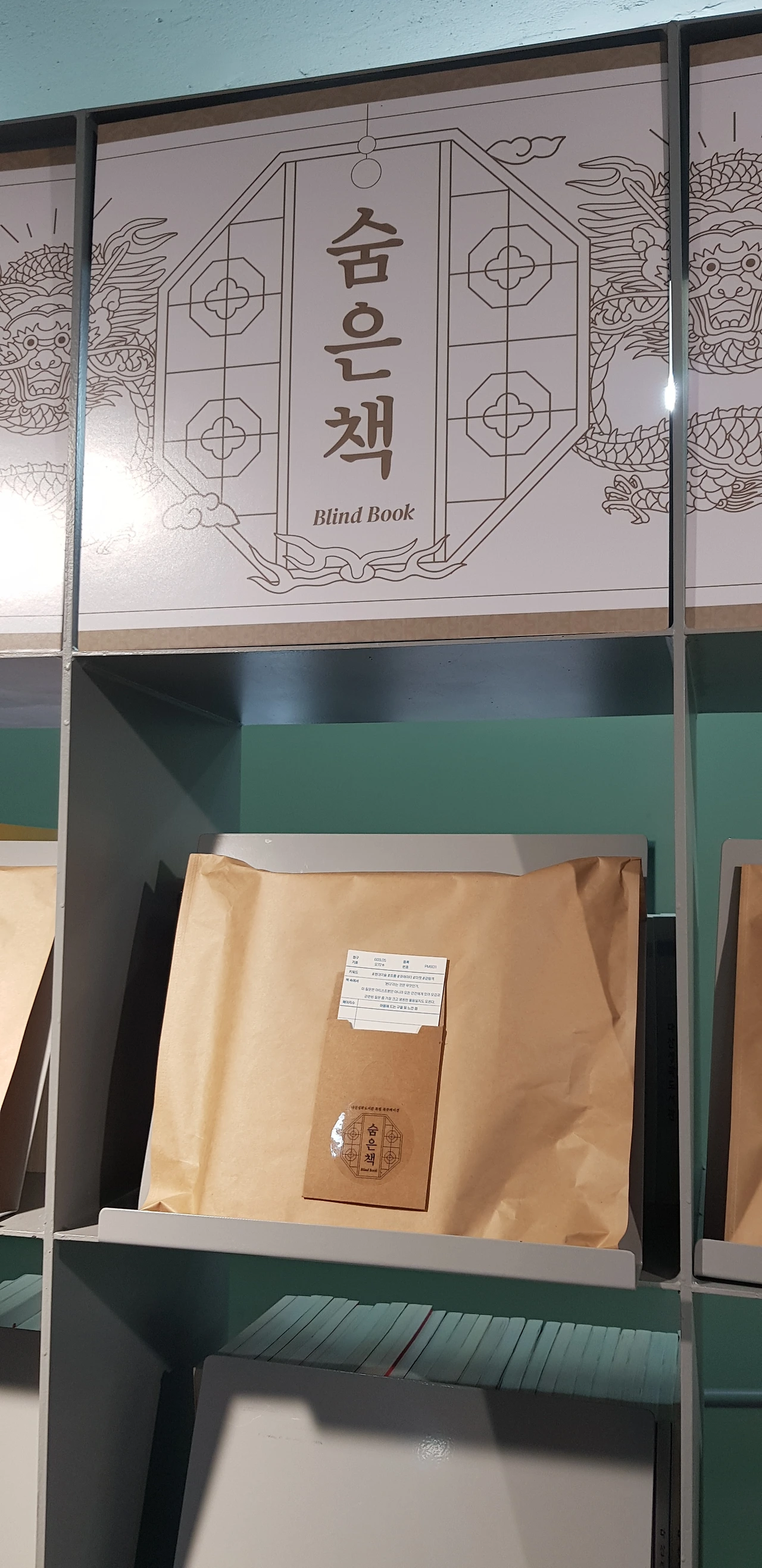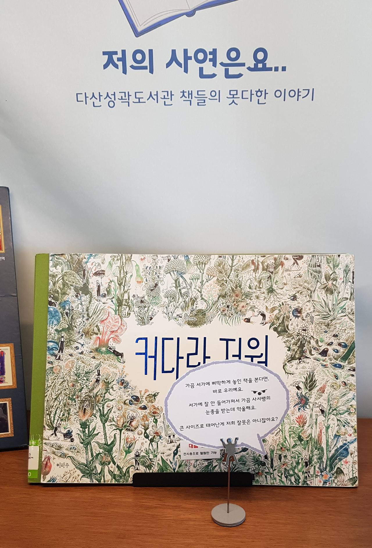 -아무도 모르게 포장지로 꽁꽁 싸맨 책이 눈에 띄었다. 청구 기호가 적혀 있고 어떤 내용인지 약간의 힌트 문장만 있다. 그런데 아까워서 저 포장지를 풀어 볼 수나 있으려나? 누가 빌려 가는 걸까? 전시용일까? 서울시민이 아닌 데다가 이방인인 나는 군침만 삼키다 돌아섰다. (나가려는 차에 발견한 책이라 미처 물어보지를 못했다. 다음에 가면 물어라도 봐야겠다.)