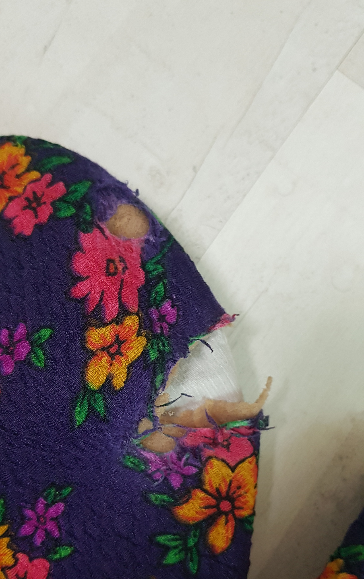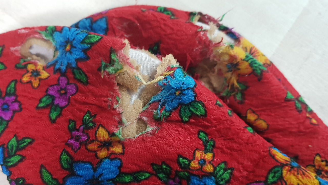 그리고 버선이 지닌 의외의 매력! 버선을 신으면 좀 재밌다. 단점일 수도 있지만 우리가 산 버선들은 미끄럼 방지가 없다. 그래서 마루 위를 미끄러지듯 재빨리 이동할 수 있었다. 그러다 결국 이런 꼴로 생을 마감한 녀석도 있다;;