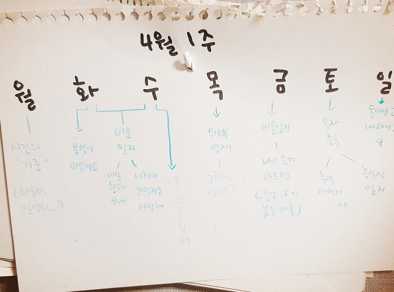 예전에는 일요일이 오면 조금은 마음이 불안했다. 하지만 나의 글쓰기만이라도 돌아보자, 라는 마음을 먹은 후로는 조금이나마 마음이 차분해졌다. 월요일이 오는 것이 살짝 기다려질 때도 있다. 어제(일요일)의 내가 쓰기로 한 글이 있잖아! 이러면서 나를 응원할 수 있어서.