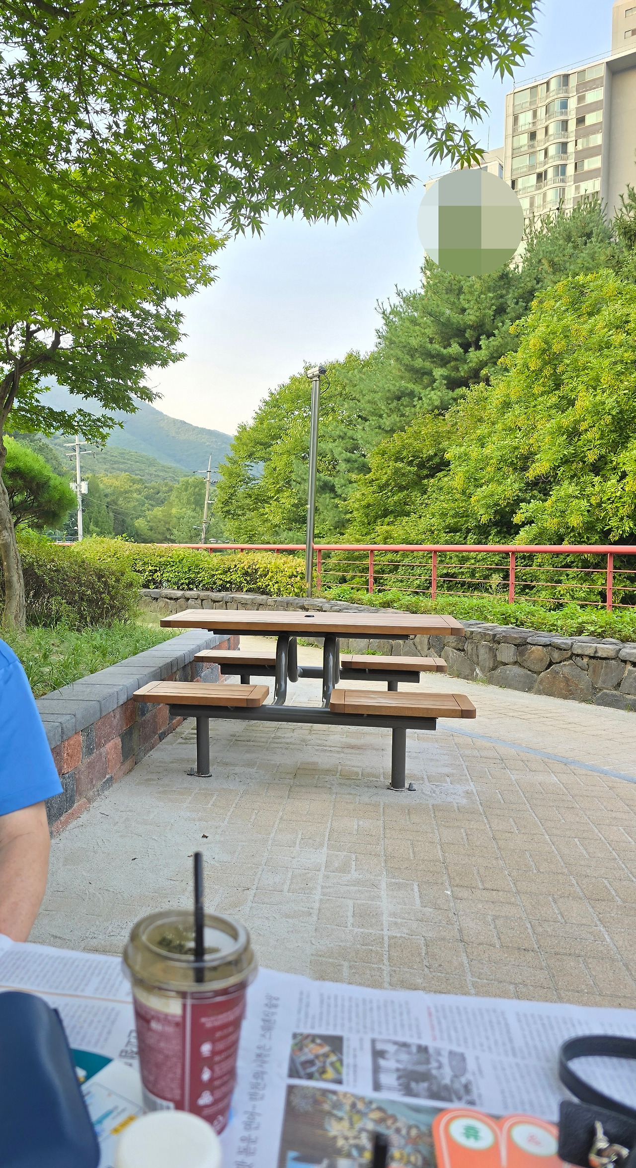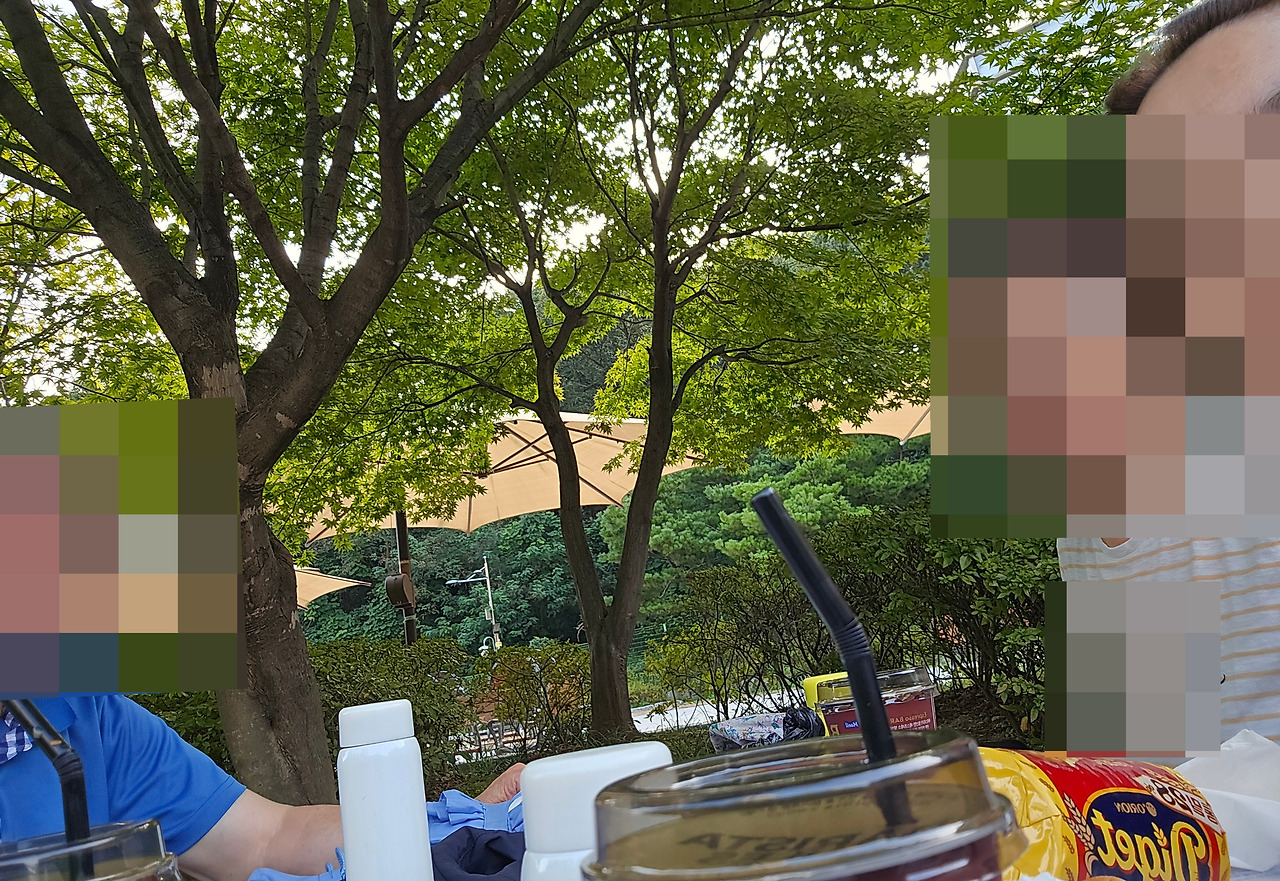 도서관에 갔다가 도서관 안에는 들어가지도 않고 도서관 앞마당 의자에서 가족들과 '미니 소풍'을 즐기고 돌아왔던 그때 그 사진.