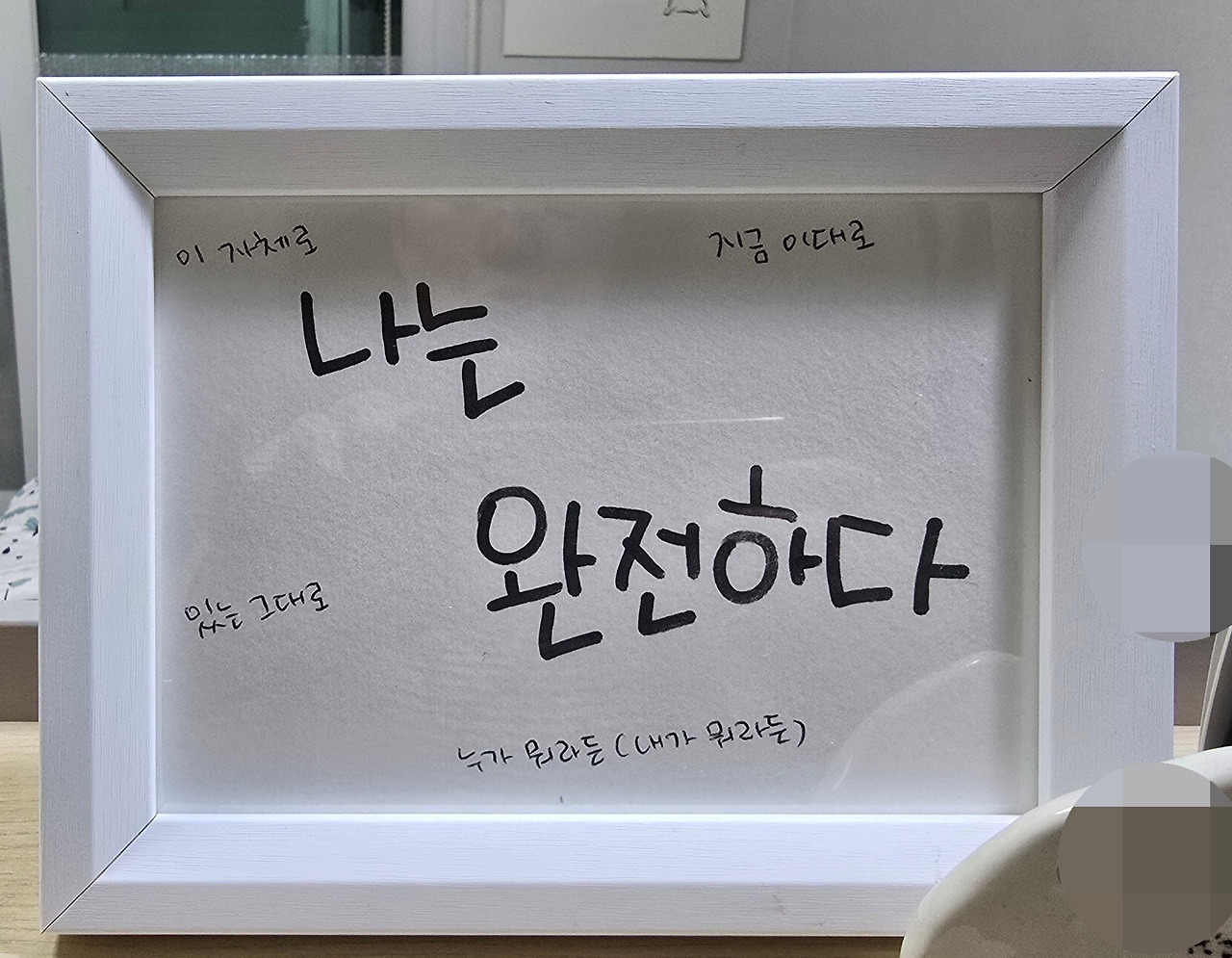 친구야, 난 요즘 이러고 살아. ('나는 완전하다' 액자 사진을 보여 준다.) 생각해 보니까 내가 그~렇게까지 불완전한 사람은 아닌 것 같아. 그리고 누구의 판단에 따라서 완전해졌다가 불완전해졌다가 쓸 만한 사람이었다가 하등 쓸데없는 사람이었다가... 그게 맞는 걸까?