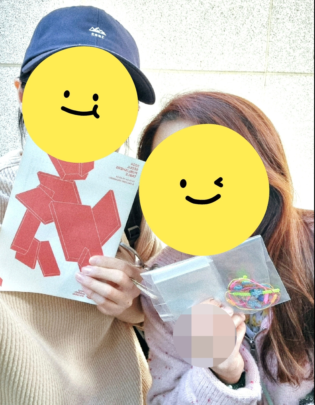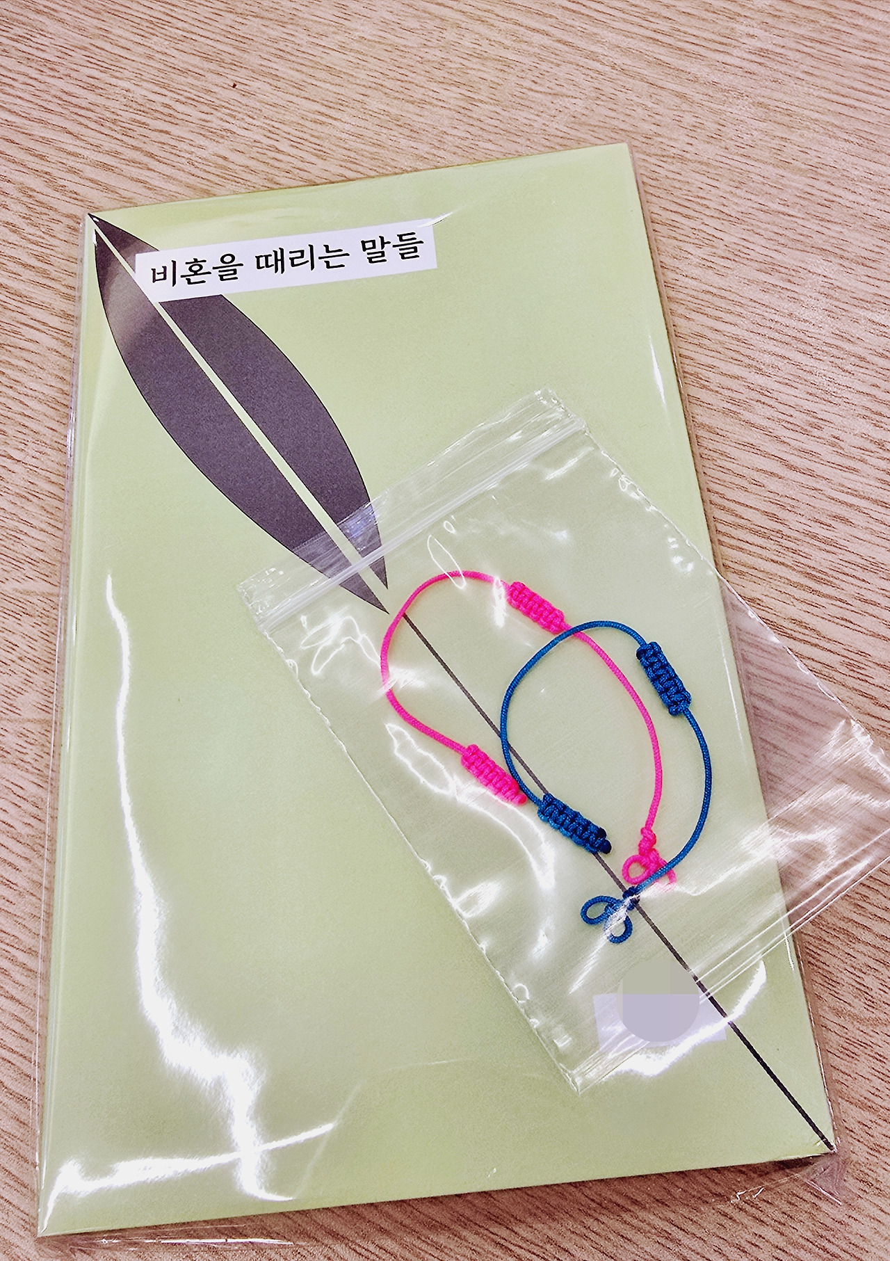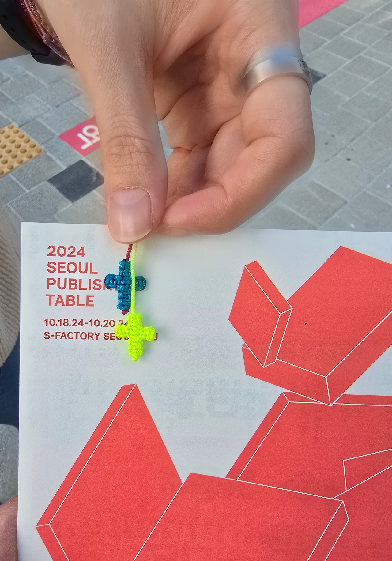 아니 이거(수제 매듭 책갈피)를, 사람들이 언니 책 사 갈 때마다 주라고 하려고... 오늘 오전까지 계속 만들어서 딱 왔는데, 와 보니 언니가 없는 거야! 서프라이즈로 오려고 했는데!