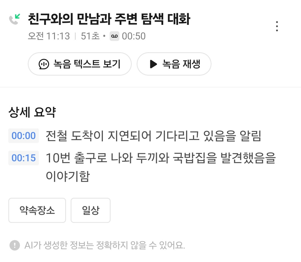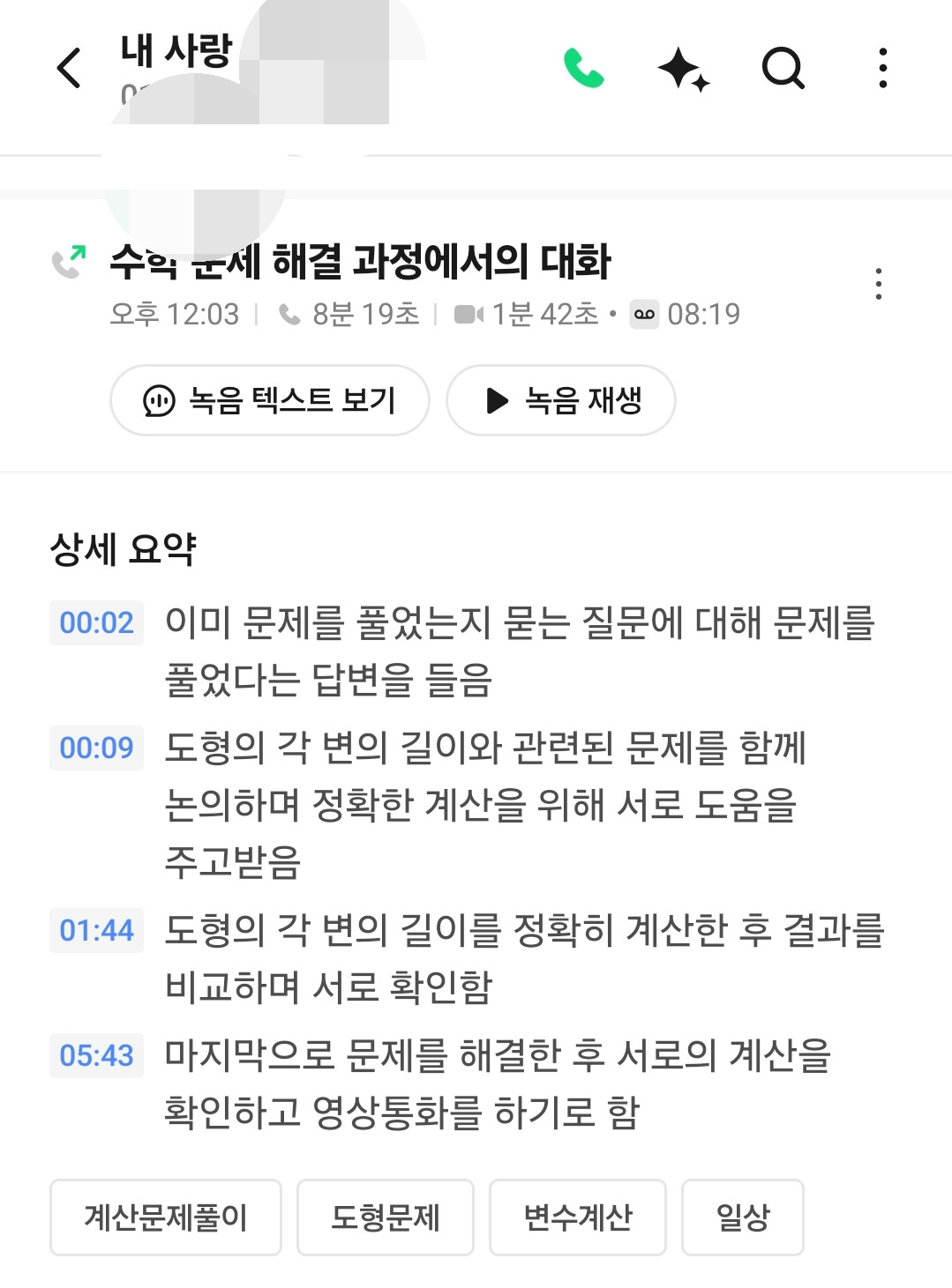 한번은 쌍둥이 조카 하나가 내게 전화를 했다. 집에서 혼자 수학 문제를 풀고 있는데 잘 모르겠다며 알려 달라고 한다. (자기 엄마는 동생을 데리고 이비인후과에 갔고 아빠는 지금 회사 점심시간이라 수학 문제를 가르쳐 줄 수 없다고 한다.) 외출 중이었던 나는 영상 통화로 수학 문제를 갈무리(캡처)하여 확인한 후, 다시 전화로 수학 문제에 관해 조카와 심도(?) 있는 수학적 대화를 나누었다. (다행히 쉬운 문제였다.) 이 또한 AI가 살뜰히 통화를 요약해 주었다.