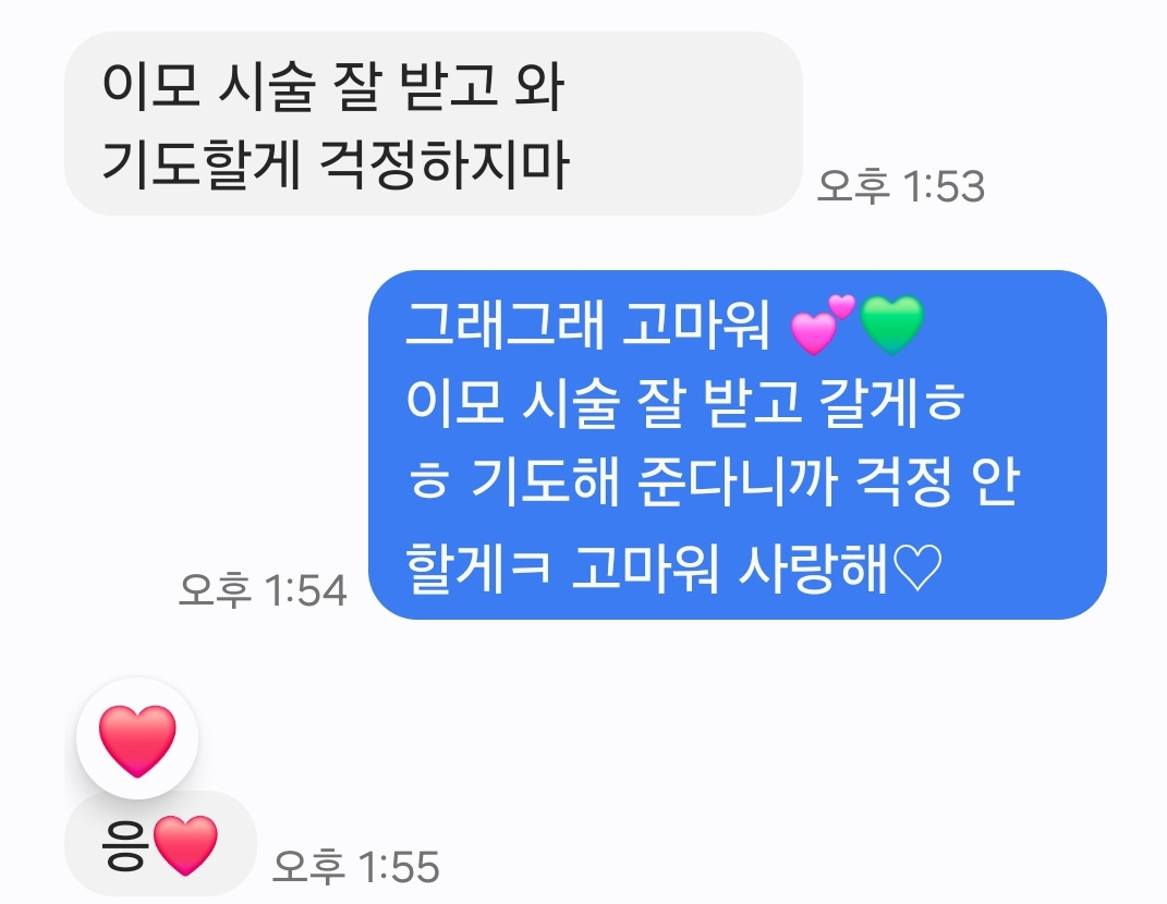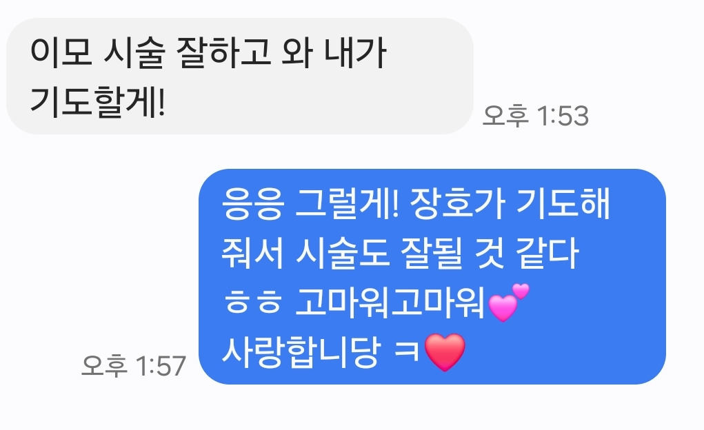 어디 그것뿐인가. 입원 내내 옆에서 짐을 들어 주는 사람, 말동무와 염려를 동시에 건네주는 내 사람, 봄보미 엄마가 있다. 시술실 바깥에는 함께 기도 중인 아버지도 봄보미 곁에 있다. 거기다 때마침 일이 없다는 동생이 봄보미를 병원까지 데려다준단다. "퇴원 때도 데리러 올게. 전화해 줘." 차로 편하게 이동할 수 있는 시대에 살고 있다니. 봄보미는 차가 없지만 주변에는 차가 있는 동생이 있다. 기적은 여기서 그치지 않고 이런 연락도 보내온다.