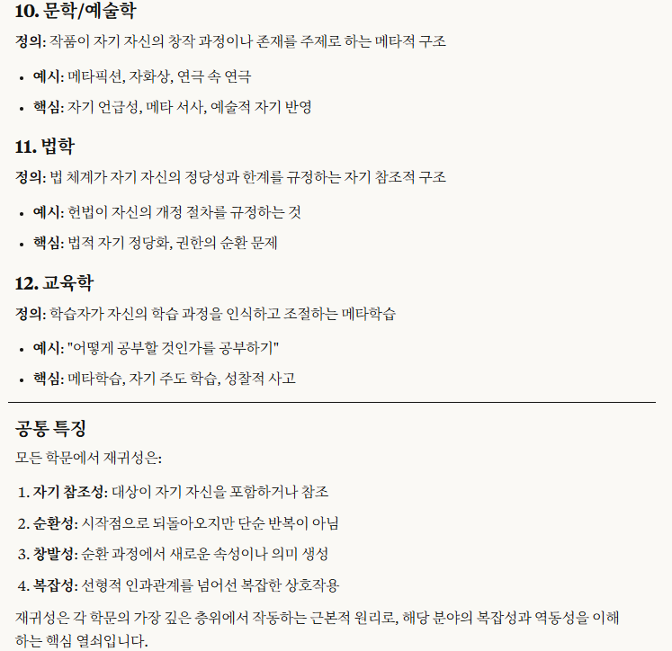 다시 돌아간다. 재귀성은 어떤 대상이나 개념이 자기 자신을 다시 참조하거나 포함하는 특성을 말한다. 즉, "자기 자신으로 다시 돌아간다"는 뜻이다. 재귀성의 의미로 쓰이는 학문이 어떻게 구성되었는지 찾아보았다. 수학에서 시작된 재귀성 개념이 컴퓨터 과학, 언어학, 철학, 심리학, 사회학, 경제학에 이르기까지 어떻게 확산되고 변주되었는지를 추적하는 과정은 흥미진진했다. 각 학문에서 재귀성이 다르게 정의되지만, 공통점도 있었다. 자기 참조성, 순환성, 창발성, 복잡성.