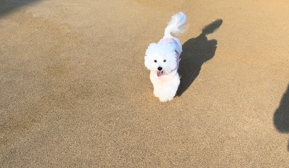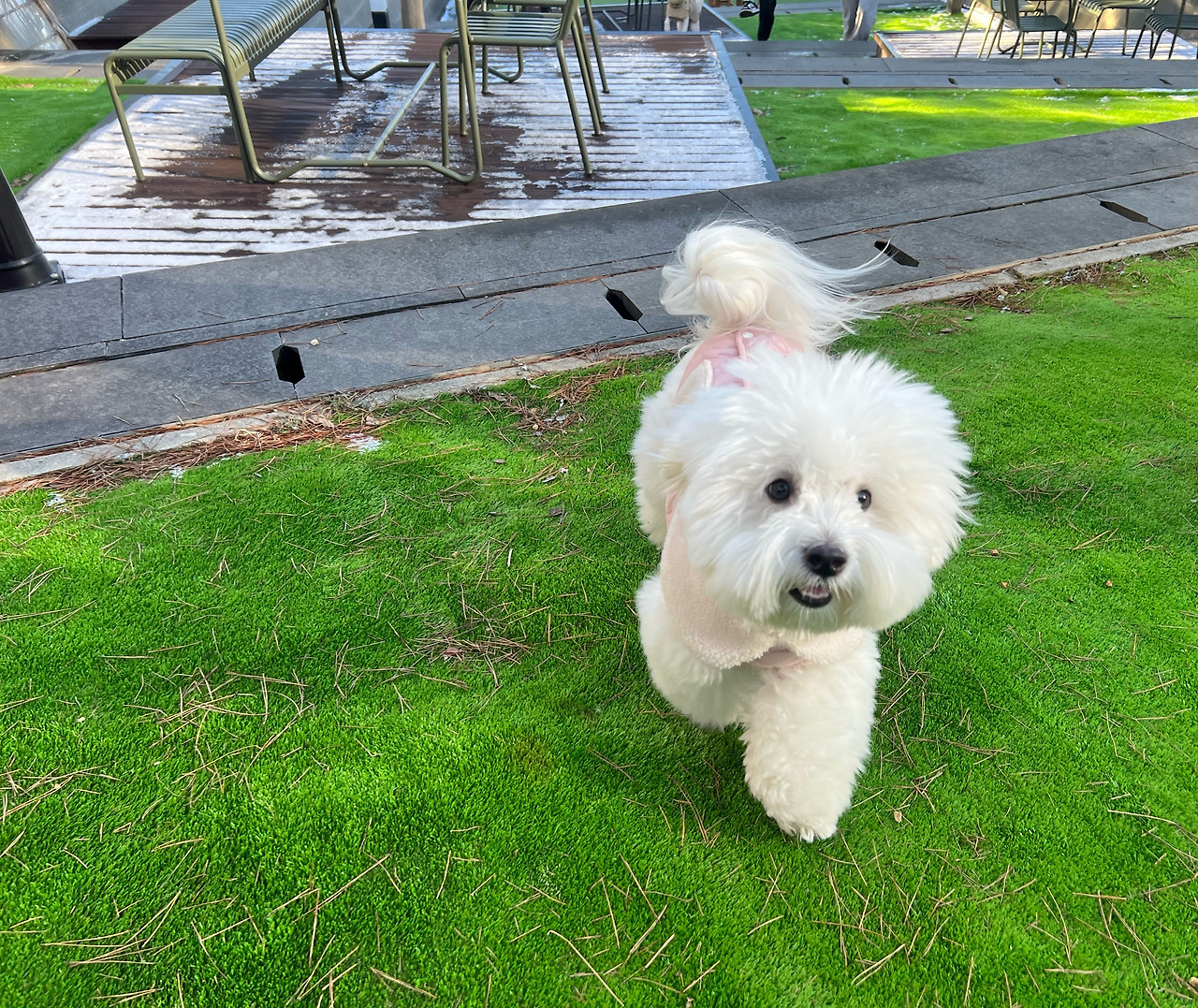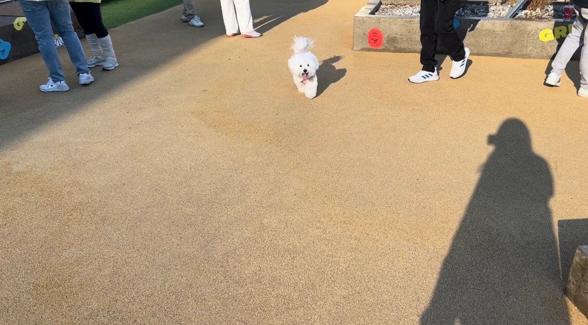 사랑이도 마음에 드는지 그제야 뛰기 시작했다. 내향적인 강아지라서 우리 주변에서 놀다가 마음 맞는 친구들이 있을 때만 어울리곤 한다. 지켜보다가 멀리 갔다 싶으면 “사랑아-” 부르면 사랑이는 돌아보고 전속력을 내며 뛰어온다. 많은 사람들 속에서도 우리를 찾아내고 달려오는 뭉클한 순간. 그 모습을 볼 때마다 울컥한다. 애견 카페 실외 놀이터에 보호자들은 두 부류로 나뉜다. 같이 뛰거나, 아니면 어슬렁 다닌다. 하네스 없이 자유롭게 뛸 수 있는 곳에서만 볼 수 있는 내 강아지의 표정을 본다. 같이 안 뛸 수가 없어서 저절로 몸이 움직여진다. 체력이 좋지 못해서 금방 지치지만 할 수 있는 만큼 함께 뛰어다닌다. 어쩌면 내가 사랑이랑 놀아주는 게 아니라, 사랑이가 나와 놀아주는 것일지도 모르겠다.