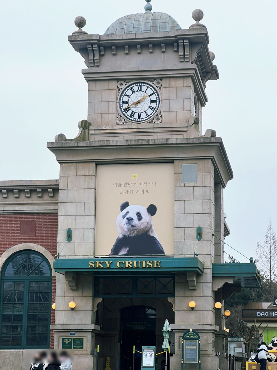 남편은 그럴 줄 알았다는 듯 웃으며 사진을 찍어줬다. 나는 거대한 판다가 서 있는 곳 앞에서 미소를 지으며 포즈를 취했다. 에버랜드에는 눈만 돌리면 푸바오 사진을 볼 수 있었는데 커다란 시계탑 밑에는 '너를 만난 건 기적이야. 고마워. 푸바오.'라고 적힌 포스터가 붙어있었다. 그걸 보니 울컥함이 밀려왔고 우리는 푸바오를 만나기 위해서 길고 긴 줄에 동참했다.