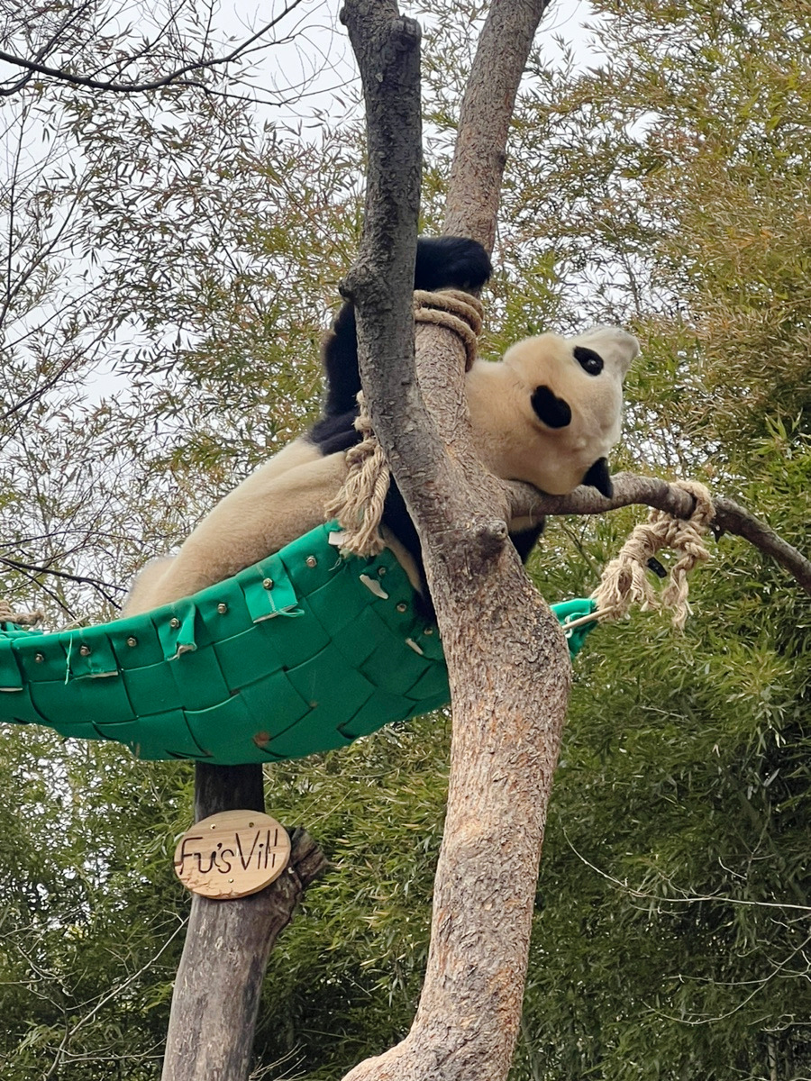 이제 진짜 오늘의 주인공을 만날 시간이 다가왔다. 곁에 있는 사람들의 표정을 보니 한결같이 기대를 잔뜩 하고 있었다. 문이 열리고 들어서니 우리 푸공주님은 송바오님이 새로 만들어 준 초록색 해먹에서 벌러덩 누워있었다. 만나고 싶고, 보고 싶었던 푸바오를 눈앞에서 직접 마주하니 훨씬 좋았다. 5분의 시간밖에 없는데 이쪽으로 한 번 안 돌아봐 주나 마음속으로 텔레파시를 보냈다. 그때 불현듯 푸바오가 움직이기 시작했다. 해먹에서 꼼짝 안 할 것 같더니 내려오기 시작한 것이다. 그러고 나서는 한 바퀴를 휙 돌아서 저쪽에 있는 사람들에게 팬 서비스로 퍼포먼스를 해주고 내가 있는 쪽으로 다가왔다. 한 발 한 발 움직일 때마다 놓칠까 봐 바쁘게 사진을 찍었다. 동영상과 사진을 둘 다 찍고 실물로도 봐야 하니 정신이 없었다. 푸바오를 보는 사람들은 판다 월드에 입장 전 조용히 해달라는 공지를 잘 지켰다. 실제로 사진으로 담아내고 직접 눈으로도 보느라 말할 틈이 없었다. 연예인보다 더 연예인 푸바오가 걸어서 내 쪽으로 가까이 오자 행복함은 두 배가 되었다. 푸바오에 대해서 아무것도 몰랐던 남편은 판다를 보자마자 매력에 빠졌다. 때마침 송바오님이 살짝 얼굴을 내밀었더니 금세 쪼르르 사육사님께 다가가는 푸바오의 모습을 보면서 영상으로만 봐오던 둘의 케미를 알 수 있었다. 짧은 5분이었지만 너무나 소중한 시간이었다.